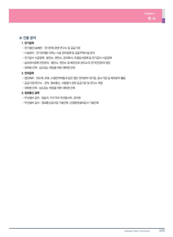 Sejong Cyber University 103Chapter%u2161%ud559 %uc0ac %u2299 %uc9c4%ucd9c %ubd84%uc57c 1. %uc804%uae30%uacf5%ud559 - %uc804%uae30%uc0dd%uc0b0/%uc1a1%ubc30%uc804 : %uc804%uae30%uc804%ub825 %uad00%ub828 %uc5f0%uad6c%uc18c %ubc0f %uacf5%uacf5%uae30%uad00 - %uc2dc%uc124%uad00%ub9ac : %uc804%uae30%uc804%ub825%uc744 %ub2e4%ub8e8%ub294 %uc2dc%uc124 %uad00%ub9ac%uc5c5%uccb4 %ubc0f %uacf5%ub3d9%uc8fc%ud0dd%uc2dc%uc124 %uad00%ub9ac - %uc804%uae30%uacf5%uc0ac %uc2dc%uacf5%uc5c5%uccb4 : %ubc1c%uc804%uc18c, %ubcc0%uc804%uc18c, %uac10%ub9ac%ud68c%uc0ac, %uc870%uba85%uacf5%uc0ac%uc5c5%uccb4 %ub4f1 %uc804%uae30%uacf5%uc0ac %uc2dc%uacf5%uc5c5%uccb4 - %uc1a1%uc720%uad00%uc0ac%uc5c5%uccb4 %uc548%uc804%uad00%ub9ac : %ubc1c%uc804%uc18c, %ubcc0%uc804%uc18c %ubc0f %ubc30%uc804%uc120%ub85c %uad00%ub9ac%uc18c%uc758 %uc804%uae30%uc548%uc804%uad00%ub9ac %ub2f4%ub2f9 - %ub300%ud559%uc6d0 %uc9c4%ud559 : %uc2ec%ub3c4%uc788%ub294 %ud559%uc5c5%uc744 %uc704%ud55c %ub300%ud559%uc6d0 %uc9c4%ud559 2. %uc804%uc790%uacf5%ud559 - %ucca8%ub2e8%uc81c%uc870 : %ubc18%ub3c4%uccb4, %ub85c%ubd07, %uc18c%ud615%uc804%uc790%ubd80%ud488%uacfc %uac19%uc740 %ucca8%ub2e8 %uc804%uc790%ubd84%uc57c %ub300%uae30%uc5c5, %uc911%uc18c%uae30%uc5c5 %ub4f1 %uc81c%uc870%ubd84%uc57c %ud65c%ub3d9 - %uacf5%uacf5%uae30%uad00/%uc5f0%uad6c%uc18c : %uc804%uc790, %uc815%ubcf4%ud1b5%uc2e0, %uc2dc%ud5d8%ud3c9%uac00 %uad00%ub828 %uacf5%uacf5%uae30%uad00 %ubc0f %uc5f0%uad6c%uc18c %ucde8%uc5c5 - %ub300%ud559%uc6d0 %uc9c4%ud559 : %uc2ec%ub3c4%uc788%ub294 %ud559%uc5c5%uc744 %uc704%ud55c %ub300%ud559%uc6d0 %uc9c4%ud559 3. %uc815%ubcf4%ud1b5%uc2e0 %uacf5%ud559 - %ubb34%uc120%uc124%ube44 %uac10%ub9ac : %ubc29%uc1a1%uad6d, %uc9c0%uad6c%uad6d%uc758 %ubb34%uc120%uc885%uc0ac%uc790, %uac10%ub9ac%uc6d0 - %ubb34%uc120%uc124%ube44 %uacf5%uc0ac : %uc815%ubcf4%ud1b5%uc2e0%uacf5%uc0ac%uc5c5 %uae30%uc220%uc778%ub825, %uc0b0%uc5c5%ud658%uacbd%uc124%ube44%uacf5%uc0ac %uae30%uc220%uc778%ub825