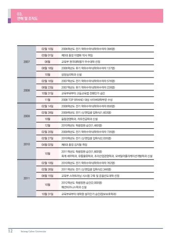 12 Sejong Cyber University200702%uc6d4 10%uc77c 2006%ud559%ub144%ub3c4 %uc804%uae30 %ud559%uc704%uc218%uc5ec%uc2dd(%ud559%uc704%uc218%uc5ec%uc790 396%uba85)03%uc6d4 01%uc77c %uc81c5%ub300 %ucd1d%uc7a5 %uc774%ubcd1%ud654 %ubc15%uc0ac %ucde8%uc78406%uc6d4 %uad50%uc721%ubd80 %uc6d0%uaca9%ub300%ud559%ud3c9%uac00 %uc6b0%uc218%ub300%ud559 %uc120%uc81508%uc6d4 18%uc77c 2006%ud559%ub144%ub3c4 %ud6c4%uae30 %ud559%uc704%uc218%uc5ec%uc2dd(%ud559%uc704%uc218%uc5ec%uc790 137%uba85)10%uc6d4 %uc0c1%ub2f4%uc2ec%ub9ac%ud559%uacfc %uc2e0%uc124200802%uc6d4 16%uc77c 2007%ud559%ub144%ub3c4 %uc804%uae30 %ud559%uc704%uc218%uc5ec%uc2dd(%ud559%uc704%uc218%uc5ec%uc790 576%uba85)08%uc6d4 23%uc77c 2007%ud559%ub144%ub3c4 %ud6c4%uae30 %ud559%uc704%uc218%uc5ec%uc2dd(%ud559%uc704%uc218%uc5ec%uc790 228%uba85)10%uc6d4 31%uc77c %uad50%uc721%ubd80%ub85c%ubd80%ud130 %uace0%ub4f1%uad50%uc721%ubc95 %uc804%ud658%uc778%uac00 %uc2b9%uc77811%uc6d4 2008 TOP BRAND %ub300%uc0c1 %uc0ac%uc774%ubc84%ub300%ud559%ubd80%ubb38 %uc218%uc0c1200902%uc6d4 14%uc77c 2008%ud559%ub144%ub3c4 %uc804%uae30 %ud559%uc704%uc218%uc5ec%uc2dd(%ud559%uc704%uc218%uc5ec%uc790 656%uba85)02%uc6d4 28%uc77c 2009%ud559%ub144%ub3c4 %uc804%uae30 %uc2e0/%ud3b8%uc785%uc0dd %uc785%ud559%uc2dd(1,603%uba85)10%uc6d4 %uc735%ud569%uacbd%uc601%ud559%uacfc, %uc790%uc720%uc804%uacf5%ud559%uacfc %uc2e0%uc12412%uc6d4 2010%ud559%ub144%ub3c4 %ud559%uc0dd%uc815%uc6d0 %uc2b9%uc778(1,460%uba85)201002%uc6d4 20%uc77c 2009%ud559%ub144%ub3c4 %uc804%uae30 %ud559%uc704%uc218%uc5ec%uc2dd(%ud559%uc704%uc218%uc5ec%uc790 735%uba85)02%uc6d4 27%uc77c 2010%ud559%ub144%ub3c4 %uc804%uae30 %uc2e0/%ud3b8%uc785%uc0dd %uc785%ud559%uc2dd(2,035%uba85)04%uc6d4 02%uc77c %uc81c6%ub300 %ucd1d%uc7a5 %uae40%uc9c0%ucca0 %ucde8%uc784 10%uc6d4 2011%ud559%ub144%ub3c4 %ud559%uc0dd%uc815%uc6d0 %uc2b9%uc778(1,800%uba85)%ud68c%uacc4%u00b7%uc138%ubb34%ud559%uacfc, %uc720%ud1b5%ubb3c%ub958%ud559%uacfc, %uc870%ub9ac%uc0b0%uc5c5%uacbd%uc601%ud559%uacfc, %ubaa8%ubc14%uc77c%uc5b4%ud50c%ub9ac%ucf00%uc774%uc158%uac1c%ubc1c%ud559%uacfc %uc2e0%uc124201102%uc6d4 19%uc77c 2010%ud559%ub144%ub3c4 %uc804%uae30 %ud559%uc704%uc218%uc5ec%uc2dd(%ud559%uc704%uc218%uc5ec%uc790 762%uba85)02%uc6d4 26%uc77c 2011%ud559%ub144%ub3c4 %uc804%uae30 %uc2e0/%ud3b8%uc785%uc0dd %uc785%ud559%uc2dd(2,346%uba85)06%uc6d4 15%uc77c %uad50%uc721%ubd80 %uc2a4%ub9c8%ud2b8%ub7ec%ub2dd %uc2dc%uc2a4%ud15c %uad6c%ucd95 %ubc0f %uc6b4%uc6a9%uc120%ub3c4%ub300%ud559 %uc120%uc81510%uc6d4 2012%ud559%ub144%ub3c4 %ud559%uc0dd%uc815%uc6d0 %uc2b9%uc778(2,000%uba85)%ud328%uc158%ube44%uc988%ub2c8%uc2a4%ud559%uacfc %uc2e0%uc12410%uc6d4 31%uc77c %uad50%uc721%ubd80%ub85c%ubd80%ud130 %ub300%ud559%uc6d0 %uc124%uce58%uc778%uac00 %uc2b9%uc778(%uc815%ubcf4%ubcf4%ud638%ud559%uacfc)03.%uc5f0%ud601 %ubc0f %uc870%uc9c1%ub3c4
