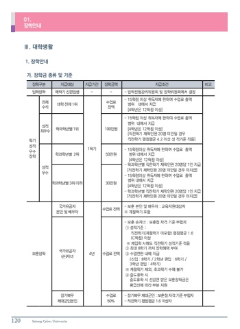 120 Sejong Cyber University01.%uc7a5%ud559%uc548%ub0b4%u2162. %ub300%ud559%uc0dd%ud65c 1. %uc7a5%ud559%uc548%ub0b4 %uac00. %uc7a5%ud559%uae08 %uc885%ub958 %ubc0f %uae30%uc900%uc7a5%ud559%uad6c%ubd84 %uc9c0%uae09%ub300%uc0c1 %uc9c0%uae09%uae30%uac04 %uc7a5%ud559%uae08%uc561 %uc9c0%uae09%uc870%uac74 %ube44%uace0%uc785%ud559%uc7a5%ud559 %ub9e4%ud559%uae30 %uc2e0%ud3b8%uc785%uc0dd - - - %uc785%ud559%uc804%ud615%uad00%ub9ac%uc704%uc6d0%ud68c %ubc0f %uc7a5%ud559%uc704%uc6d0%ud68c%uc5d0%uc11c %uacb0%uc815%ud559%uae30%uc131%uc801%uc6b0%uc218%uc7a5%ud559%uc804%uccb4%uc218%uc11d %ub300%ud559 %uc804%uccb4 1%uc7041%ud559%uae30%uc218%uc5c5%ub8cc%uc804%uc561- 15%ud559%uc810 %uc774%uc0c1 %ucde8%ub4dd%uc790%uc5d0 %ud55c%ud558%uc5ec %uc218%uc5c5%ub8cc %ucd1d%uc561 %ubc94%uc704 %ub0b4%uc5d0%uc11c %uc9c0%uae09 [4%ud559%ub144%uc740 12%ud559%uc810 %uc774%uc0c1]%uc131%uc801%ucd5c%uc6b0%uc218 %ud559%uacfc%ud559%ub144%ubcc4 1%uc704 100%ub9cc%uc6d0- 15%ud559%uc810 %uc774%uc0c1 %ucde8%ub4dd%uc790%uc5d0 %ud55c%ud558%uc5ec %uc218%uc5c5%ub8cc %ucd1d%uc561 %ubc94%uc704 %ub0b4%uc5d0%uc11c %uc9c0%uae09 [4%ud559%ub144%uc740 12%ud559%uc810 %uc774%uc0c1] [%uc9c1%uc804%ud559%uae30 %uc7ac%ud559%uc778%uc6d0 20%uba85 %ubbf8%ub9cc%uc77c %uacbd%uc6b0 %uc9c1%uc804%ud559%uae30 %ud3c9%uc810%ud3c9%uade0 4.2 %uc774%uc0c1 %uc131 %uc801%uae30%uc900 %uc801%uc6a9]%uc131%uc801%uc6b0%uc218%ud559%uacfc%ud559%ub144%ubcc4 2%uc704 50%ub9cc%uc6d0- 15%ud559%uc810%uc774%uc0c1 %ucde8%ub4dd%uc790%uc5d0 %ud55c%ud558%uc5ec %uc218%uc5c5%ub8cc %ucd1d%uc561 %ubc94%uc704 %ub0b4%uc5d0%uc11c %uc9c0%uae09 [4%ud559%ub144%uc740 12%ud559%uc810 %uc774%uc0c1]- %ud559%uacfc%ud559%ub144%ubcc4 %uc9c1%uc804%ud559%uae30 %uc7ac%ud559%uc778%uc6d0 20%uba85%ub2f9 1%uc778 %uc9c0%uae09 [%uc9c1%uc804%ud559%uae30 %uc7ac%ud559%uc778%uc6d0 20%uba85 %ubbf8%ub9cc%uc77c %uacbd%uc6b0 %ubbf8%uc9c0%uae09]- 15%ud559%uc810%uc774%uc0c1 %ucde8%ub4dd%uc790%uc5d0 %ud55c%ud558%uc5ec %uc218%uc5c5%ub8cc %ucd1d%uc561 %ubc94%uc704 %ub0b4%uc5d0%uc11c %uc9c0%uae09 [4%ud559%ub144%uc740 12%ud559%uc810 %uc774%uc0c1]- %ud559%uacfc%ud559%ub144%ubcc4 %uc9c1%uc804%ud559%uae30 %uc7ac%ud559%uc778%uc6d0 20%uba85%ub2f9 1%uc778 %uc9c0%uae09 [%uc9c1%uc804%ud559%uae30 %uc7ac%ud559%uc778%uc6d0 20%uba85 %ubbf8%ub9cc%uc77c %uacbd%uc6b0 %ubbf8%uc9c0%uae09]%ud559%uacfc%ud559%ub144%ubcc4 3%uc704 %uc774%ud558 30%ub9cc%uc6d0%ubcf4%ud6c8%uc7a5%ud559%uad6d%uac00%uc720%uacf5%uc790%ubcf8%uc778 %ubc0f %ubc30%uc6b0%uc7904%ub144%uc218%uc5c5%ub8cc %uc804%uc561 - %ubcf4%ud6c8 %ubcf8%uc778 %ubc0f %ubc30%uc6b0%uc790 : %uad50%uc721%uc9c0%uc6d0%ub300%uc0c1%uc790%u203b %uacc4%uc808%ud559%uae30 %ud3ec%ud568%uad6d%uac00%uc720%uacf5%uc790(%uc190)%uc790%ub140 %uc218%uc5c5%ub8cc %uc804%uc561- %ubcf4%ud6c8 %uc190%uc790%ub140 : %ubcf4%ud6c8%uccad %uc790%uaca9 %uae30%uc900 %ubd80%ud569%uc790 %u2460 %uc131%uc801%uae30%uc900 : %uc9c1%uc804%ud559%uae30(%uacc4%uc808%ud559%uae30 %ubbf8%ud3ec%ud568) %ud3c9%uc810%ud3c9%uade0 1.6 (C%ud559%uc810) %uc774%uc0c1 %u203b %uc7ac%uc785%ud559 %uc2dc%uc5d0%ub3c4 %uc9c1%uc804%ud559%uae30 %uc131%uc801%uae30%uc900 %uc801%uc6a9 %u2461 %ucd5c%ub300 8%ud559%uae30 %uae4c%uc9c0 %uc7a5%ud559%ud61c%ud0dd %ubd80%uc5ec %u2462 %uc218%uc5c5%uc5f0%ud55c %ub0b4%uc5d0 %uc9c0%uae09 (%uc2e0%uc785 : 8%ud559%uae30 / 2%ud559%ub144 %ud3b8%uc785 : 6%ud559%uae30 / 3%ud559%ub144 %ud3b8%uc785 : 4%ud559%uae30) %u203b %uacc4%uc808%ud559%uae30 %uc81c%uc678, %ucd08%uacfc%ud559%uae30 %uc218%ud61c %ubd88%uac00 %u2463 %uc911%ub3c4%ud734%ud559 %uc2dc %uc911%ub3c4%ud734%ud559 %uc2dc %uc120%uac10%uba74 %ubc1b%uc740 %ubcf4%ud6c8%uc7a5%ud559%uae08%uc740 %ud658%uae09%uc120%uc5d0 %ub530%ub77c %ubd80%ubd84 %uc9c0%uc6d0%uc7a5%uae30%ubcf5%ubb34%uc81c%ub300%uad70%uc778%ubcf8%uc778%uc218%uc5c5%ub8cc50%- %uc7a5%uae30%ubcf5%ubb34 %uc81c%ub300%uad70%uc778 : %ubcf4%ud6c8%uccad %uc790%uaca9 %uae30%uc900 %ubd80%ud569%uc790- %uc9c1%uc804%ud559%uae30 %ud3c9%uc810%ud3c9%uade0 1.6 %uc774%uc0c1%uc790