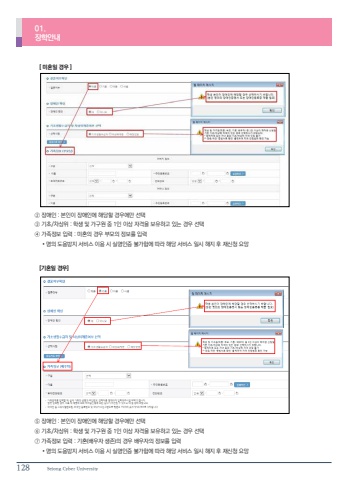 128 Sejong Cyber University01.%uc7a5%ud559%uc548%ub0b4 [ %ubbf8%ud63c%uc77c %uacbd%uc6b0 ] [%uae30%ud63c%uc77c %uacbd%uc6b0]%u2464 %uc7a5%uc560%uc778 : %ubcf8%uc778%uc774 %uc7a5%uc560%uc778%uc5d0 %ud574%ub2f9%ud560 %uacbd%uc6b0%uc5d0%ub9cc %uc120%ud0dd%u2465 %uae30%ucd08/%ucc28%uc0c1%uc704 : %ud559%uc0dd %ubc0f %uac00%uad6c%uc6d0 %uc911 1%uc778 %uc774%uc0c1 %uc790%uaca9%uc744 %ubcf4%uc720%ud558%uace0 %uc788%ub294 %uacbd%uc6b0 %uc120%ud0dd%u2466 %uac00%uc871%uc815%ubcf4 %uc785%ub825 : %uae30%ud63c(%ubc30%uc6b0%uc790 %uc0dd%uc874)%uc758 %uacbd%uc6b0 %ubc30%uc6b0%uc790%uc758 %uc815%ubcf4%ub97c %uc785%ub825 %u2022 %uba85%uc758 %ub3c4%uc6a9%ubc29%uc9c0 %uc11c%ube44%uc2a4 %uc774%uc6a9 %uc2dc %uc2e4%uba85%uc778%uc99d %ubd88%uac00%ud568%uc5d0 %ub530%ub77c %ud574%ub2f9 %uc11c%ube44%uc2a4 %uc77c%uc2dc %ud574%uc9c0 %ud6c4 %uc7ac%uc2e0%uccad %uc694%ub9dd%u2461 %uc7a5%uc560%uc778 : %ubcf8%uc778%uc774 %uc7a5%uc560%uc778%uc5d0 %ud574%ub2f9%ud560 %uacbd%uc6b0%uc5d0%ub9cc %uc120%ud0dd%u2462 %uae30%ucd08/%ucc28%uc0c1%uc704 : %ud559%uc0dd %ubc0f %uac00%uad6c%uc6d0 %uc911 1%uc778 %uc774%uc0c1 %uc790%uaca9%uc744 %ubcf4%uc720%ud558%uace0 %uc788%ub294 %uacbd%uc6b0 %uc120%ud0dd%u2463 %uac00%uc871%uc815%ubcf4 %uc785%ub825 : %ubbf8%ud63c%uc758 %uacbd%uc6b0 %ubd80%ubaa8%uc758 %uc815%ubcf4%ub97c %uc785%ub825 %u2022 %uba85%uc758 %ub3c4%uc6a9%ubc29%uc9c0 %uc11c%ube44%uc2a4 %uc774%uc6a9 %uc2dc %uc2e4%uba85%uc778%uc99d %ubd88%uac00%ud568%uc5d0 %ub530%ub77c %ud574%ub2f9 %uc11c%ube44%uc2a4 %uc77c%uc2dc %ud574%uc9c0 %ud6c4 %uc7ac%uc2e0%uccad %uc694%ub9dd