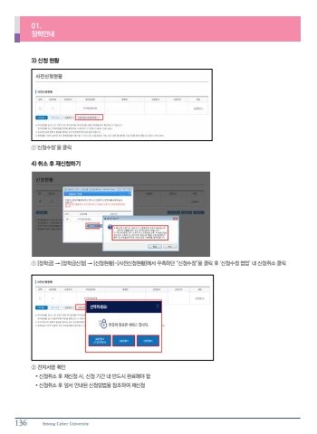 136 Sejong Cyber University01.%uc7a5%ud559%uc548%ub0b4%u2461 %uc804%uc790%uc11c%uba85 %ud655%uc778 %u2022 %uc2e0%uccad%ucde8%uc18c %ud6c4 %uc7ac%uc2e0%uccad %uc2dc, %uc2e0%uccad %uae30%uac04 %ub0b4 %ubc18%ub4dc%uc2dc %uc644%ub8cc%ud574%uc57c %ud568 %u2022 %uc2e0%uccad%ucde8%uc18c %ud6c4 %uc55e%uc11c %uc548%ub0b4%ub41c %uc2e0%uccad%ubc29%ubc95%uc744 %ucc38%uc870%ud558%uc5ec %uc7ac%uc2e0%uccad3) %uc2e0%uccad %ud604%ud6694) %ucde8%uc18c %ud6c4 %uc7ac%uc2e0%uccad%ud558%uae30%u2460%u2018%uc2e0%uccad%uc218%uc815%u2019%uc744 %ud074%ub9ad%u2460 [%uc7a5%ud559%uae08] %u2192 [%uc7a5%ud559%uae08%uc2e0%uccad] %u2192 [%uc2e0%uccad%ud604%ud669]-[%uc0ac%uc804%uc2e0%uccad%ud604%ud669]%uc5d0%uc11c %uc6b0%uce21%ud558%ub2e8 %u201c%uc2e0%uccad%uc218%uc815%u201d%uc744 %ud074%ub9ad %ud6c4 %u2018%uc2e0%uccad%uc218%uc815 %ud31d%uc5c5%u2019 %ub0b4 %uc2e0%uccad%ucde8%uc18c %ud074%ub9ad