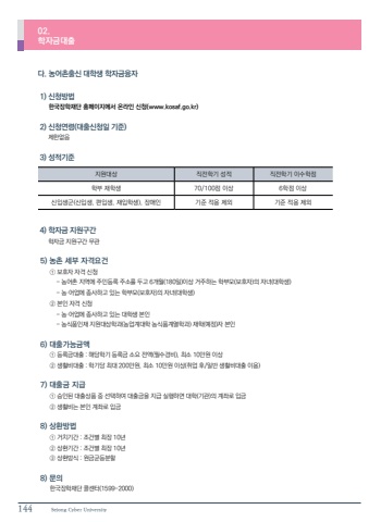 144 Sejong Cyber University02.%ud559%uc790%uae08%ub300%ucd9c%ub2e4. %ub18d%uc5b4%ucd0c%ucd9c%uc2e0 %ub300%ud559%uc0dd %ud559%uc790%uae08%uc735%uc790 1) %uc2e0%uccad%ubc29%ubc95 %ud55c%uad6d%uc7a5%ud559%uc7ac%ub2e8 %ud648%ud398%uc774%uc9c0%uc5d0%uc11c %uc628%ub77c%uc778 %uc2e0%uccad(www.kosaf.go.kr) 2) %uc2e0%uccad%uc5f0%ub839(%ub300%ucd9c%uc2e0%uccad%uc77c %uae30%uc900) %uc81c%ud55c%uc5c6%uc74c 3) %uc131%uc801%uae30%uc900 4) %ud559%uc790%uae08 %uc9c0%uc6d0%uad6c%uac04 %ud559%uc790%uae08 %uc9c0%uc6d0%uad6c%uac04 %ubb34%uad00 5) %ub18d%ucd0c %uc138%ubd80 %uc790%uaca9%uc694%uac74 %u2460 %ubcf4%ud638%uc790 %uc790%uaca9 %uc2e0%uccad - %ub18d%uc5b4%ucd0c %uc9c0%uc5ed%uc5d0 %uc8fc%ubbfc%ub4f1%ub85d %uc8fc%uc18c%ub97c %ub450%uace0 6%uac1c%uc6d4(180%uc77c)%uc774%uc0c1 %uac70%uc8fc%ud558%ub294 %ud559%ubd80%ubaa8(%ubcf4%ud638%uc790)%uc758 %uc790%ub140(%ub300%ud559%uc0dd) - %ub18d%u00b7%uc5b4%uc5c5%uc5d0 %uc885%uc0ac%ud558%uace0 %uc788%ub294 %ud559%ubd80%ubaa8(%ubcf4%ud638%uc790)%uc758 %uc790%ub140(%ub300%ud559%uc0dd) %u2461 %ubcf8%uc778 %uc790%uaca9 %uc2e0%uccad - %ub18d%u00b7%uc5b4%uc5c5%uc5d0 %uc885%uc0ac%ud558%uace0 %uc788%ub294 %ub300%ud559%uc0dd %ubcf8%uc778 - %ub18d%uc2dd%ud488%uc778%uc7ac %uc9c0%uc6d0%ub300%uc0c1%ud559%uacfc(%ub18d%uc5c5%uacc4%ub300%ud559 %ub18d%uc2dd%ud488%uacc4%uc5f4%ud559%uacfc) %uc7ac%ud559(%uc608%uc815)%uc790 %ubcf8%uc778 6) %ub300%ucd9c%uac00%ub2a5%uae08%uc561 %u2460 %ub4f1%ub85d%uae08%ub300%ucd9c : %ud574%ub2f9%ud559%uae30 %ub4f1%ub85d%uae08 %uc18c%uc694 %uc804%uc561(%ud544%uc218%uacbd%ube44), %ucd5c%uc18c 10%ub9cc%uc6d0 %uc774%uc0c1 %u2461 %uc0dd%ud65c%ube44%ub300%ucd9c : %ud559%uae30%ub2f9 %ucd5c%ub300 200%ub9cc%uc6d0, %ucd5c%uc18c 10%ub9cc%uc6d0 %uc774%uc0c1(%ucde8%uc5c5 %ud6c4/%uc77c%ubc18 %uc0dd%ud65c%ube44%ub300%ucd9c %uc774%uc6a9) 7) %ub300%ucd9c%uae08 %uc9c0%uae09 %u2460 %uc2b9%uc778%ub41c %ub300%ucd9c%uc0c1%ud488 %uc911 %uc120%ud0dd%ud558%uc5ec %ub300%ucd9c%uae08%uc744 %uc9c0%uae09 %uc2e4%ud589%ud558%uba74 %ub300%ud559(%uae30%uad00)%uc758 %uacc4%uc88c%ub85c %uc785%uae08 %u2461 %uc0dd%ud65c%ube44%ub294 %ubcf8%uc778 %uacc4%uc88c%ub85c %uc785%uae08 8) %uc0c1%ud658%ubc29%ubc95 %u2460 %uac70%uce58%uae30%uac04 : %uc870%uac74%ubcc4 %ucd5c%uc7a5 10%ub144 %u2461 %uc0c1%ud658%uae30%uac04 : %uc870%uac74%ubcc4 %ucd5c%uc7a5 10%ub144 %u2462 %uc0c1%ud658%ubc29%uc2dd : %uc6d0%uae08%uade0%ub4f1%ubd84%ud560 8) %ubb38%uc758 %ud55c%uad6d%uc7a5%ud559%uc7ac%ub2e8 %ucf5c%uc13c%ud130(1599-2000)%uc9c0%uc6d0%ub300%uc0c1 %uc9c1%uc804%ud559%uae30 %uc131%uc801 %uc9c1%uc804%ud559%uae30 %uc774%uc218%ud559%uc810%ud559%ubd80 %uc7ac%ud559%uc0dd 70/100%uc810 %uc774%uc0c1 6%ud559%uc810 %uc774%uc0c1%uc2e0%uc785%uc0dd%uad70(%uc2e0%uc785%uc0dd, %ud3b8%uc785%uc0dd, %uc7ac%uc785%ud559%uc0dd), %uc7a5%uc560%uc778 %uae30%uc900 %uc801%uc6a9 %uc81c%uc678 %uae30%uc900 %uc801%uc6a9 %uc81c%uc678