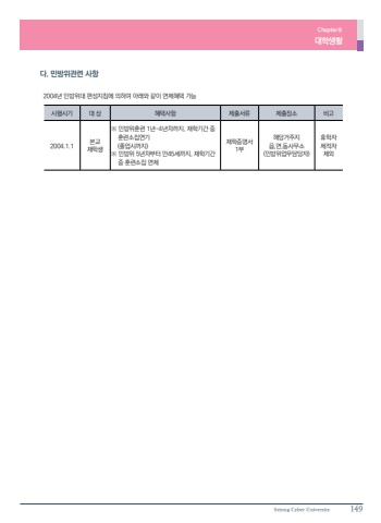 Sejong Cyber University 149Chapter%u2162%ub300%ud559%uc0dd%ud65c%ub2e4. %ubbfc%ubc29%uc704%uad00%ub828 %uc0ac%ud56d 2004%ub144 %ubbfc%ubc29%uc704%ub300 %ud3b8%uc131%uc9c0%uce68%uc5d0 %uc758%ud558%uc5ec %uc544%ub798%uc640 %uac19%uc774 %uba74%uc81c%ud61c%ud0dd %uac00%ub2a5%uc2dc%ud589%uc2dc%uae30 %ub300 %uc0c1 %ud61c%ud0dd%uc0ac%ud56d %uc81c%ucd9c%uc11c%ub958 %uc81c%ucd9c%uc7a5%uc18c %ube44%uace02004.1.1 %ubcf8%uad50%uc7ac%ud559%uc0dd%u203b %ubbfc%ubc29%uc704%ud6c8%ub828 1%ub144-4%ub144%ucc28%uae4c%uc9c0, %uc7ac%ud559%uae30%uac04 %uc911 %ud6c8%ub828%uc18c%uc9d1%uc5f0%uae30 (%uc878%uc5c5%uc2dc%uae4c%uc9c0)%u203b %ubbfc%ubc29%uc704 5%ub144%ucc28%ubd80%ud130 %ub9cc45%uc138%uae4c%uc9c0, %uc7ac%ud559%uae30%uac04 %uc911 %ud6c8%ub828%uc18c%uc9d1 %uba74%uc81c%uc7ac%ud559%uc99d%uba85%uc11c1%ubd80%ud574%ub2f9%uac70%uc8fc%uc9c0 %uc74d,%uba74,%ub3d9%uc0ac%ubb34%uc18c(%ubbfc%ubc29%uc704%uc5c5%ubb34%ub2f4%ub2f9%uc790)%ud734%ud559%uc790%uc81c%uc801%uc790%uc81c%uc678