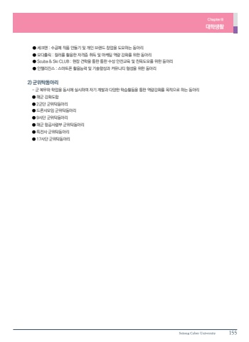 Sejong Cyber University 155Chapter%u2162%ub300%ud559%uc0dd%ud65c %u25cf %uc138%ud06c%ub9e8 : %uc218%uacf5%uc608 %uc791%ud488 %ub9cc%ub4e4%uae30 %ubc0f %uac1c%uc778 %ube0c%ub79c%ub4dc %ucc3d%uc5c5%uc744 %ub3c4%ubaa8%ud558%ub294 %ub3d9%uc544%ub9ac %u25cf %ubaa8%ub2e4%ud640%ub9ad : %uceec%ub7ec%ub97c %ud65c%uc6a9%ud55c %uc790%uaca9%uc99d %ucde8%ub4dd %ubc0f %ub9c8%ucf00%ud305 %uc5ed%ub7c9 %uac15%ud654%ub97c %uc704%ud55c %ub3d9%uc544%ub9ac %u25cf Scuba & Ski CLUB : %ud604%uc7a5 %uacac%ud559%uc744 %ud1b5%ud55c %ud1b5%ud55c %uc218%uc0c1 %uc548%uc804%uad50%uc721 %ubc0f %uce5c%ubaa9%ub3c4%ubaa8%ub97c %uc704%ud55c %ub3d9%uc544%ub9ac %u25cf %uc778%ud154%ub9ac%uc9c4%uc2a4 : %uc2a4%ub9c8%ud2b8%ud3f0 %ud65c%uc6a9%ub2a5%ub825 %ubc0f %uae30%uc220%ud5a5%uc0c1%uacfc %ucee4%ubba4%ub2c8%ud2f0 %ud615%uc131%uc744 %uc704%ud55c %ub3d9%uc544%ub9ac 2) %uad70%uc704%ud0c1%ub3d9%uc544%ub9ac - %uad70 %ubcf5%ubb34%uc640 %ud559%uc5c5%uc744 %ub3d9%uc2dc%uc5d0 %uc2e4%uc2dc%ud558%uba70 %uc790%uae30 %uacc4%ubc1c%uacfc %ub2e4%uc591%ud55c %ud559%uc2b5%ud65c%ub3d9%uc744 %ud1b5%ud55c %uc5ed%ub7c9%uac15%ud654%ub97c %ubaa9%uc801%uc73c%ub85c %ud558%ub294 %ub3d9%uc544%ub9ac %u25cf %ud574%uad70 %uac15%ud654%ub3c4%ud568 %u25cf 2%uad70%ub2e8 %uad70%uc704%ud0c1%ub3d9%uc544%ub9ac %u25cf %ub4dc%ub860%uc0ac%ubaa8%uc784 %uad70%uc704%ud0c1%ub3d9%uc544%ub9ac %u25cf 9%uc0ac%ub2e8 %uad70%uc704%ud0c1%ub3d9%uc544%ub9ac %u25cf %ud574%uad70 %ud56d%uacf5%uc0ac%ub839%ubd80 %uad70%uc704%ud0c1%ub3d9%uc544%ub9ac %u25cf %ud2b9%uc804%uc0ac %uad70%uc704%ud0c1%ub3d9%uc544%ub9ac %u25cf 17%uc0ac%ub2e8 %uad70%uc704%ud0c1%ub3d9%uc544%ub9ac