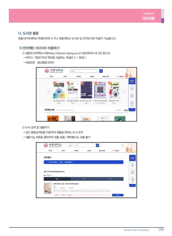 Sejong Cyber University 159%ub098. %ub3c4%uc11c%uad00 %ud65c%uc6a9%uc138%uc885%uc0ac%uc774%ubc84%ub300%ud559%uad50 %ud559%uc0dd%uc774%ub77c%uba74 %ub204%uad6c%ub098 %uc138%uc885%ub300%ud559%uad50 %ub3c4%uc11c%uad00 %ubc0f %uc804%uc790%ub3c4%uc11c%uad00 %uc774%uc6a9%uc774 %uac00%ub2a5%ud569%ub2c8%ub2e4. 1) %uc804%uc790%ucc45(E-BOOK) %uc774%uc6a9%ud558%uae30 %u2460 %uc138%uc885%ub300 %uc804%uc790%ucc45%ub3c4%uc11c%uad00(https://ebook.sejong.ac.kr) %uc811%uc18d%ud558%uc5ec%uc11c %ub85c%uadf8%uc778 %ud569%ub2c8%ub2e4. %u2022 %uc544%uc774%ub514 : %ud559%ubc88(7%uc790%ub9ac %ud559%ubc88%uc744 %uc0ac%uc6a9%ud558%ub294 %ud559%uc0dd%uc740 C + %ud559%ubc88) / %u2022 %ube44%ubc00%ubc88%ud638 : %uc0dd%ub144%uc6d4%uc77c 6%uc790%ub9ac %u2461 %ub3c4%uc11c %uac80%uc0c9 %ubc0f %ub300%ucd9c%ud558%uae30 %u2022 %uc0c1%ub2e8 %ud1b5%ud569%uac80%uc0c9%ucc3d%uc744 %uc774%uc6a9%ud558%uc5ec %ub300%ucd9c%uc744 %uc6d0%ud558%ub294 %ub3c4%uc11c %uac80%uc0c9 %u2022 %ub300%ucd9c%uac00%ub2a5 %ubc84%ud2bc%uc744 %ud074%ub9ad%ud558%uc5ec %ub300%ucd9c %uc2e4%ud589 / %uc608%uc57d%ubd88%uac00%ub294 %ub300%ucd9c %ubd88%uac00Chapter%u2162%ub300%ud559%uc0dd%ud65c