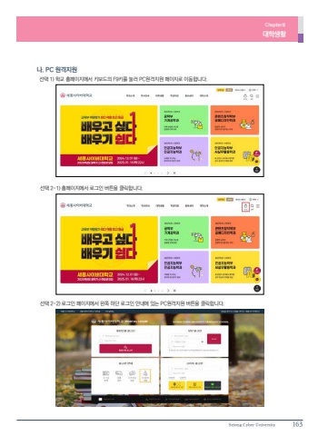 Sejong Cyber University 163Chapter%u2162%ub300%ud559%uc0dd%ud65c%ub098. PC %uc6d0%uaca9%uc9c0%uc6d0 %uc120%ud0dd 1) %ud559%uad50 %ud648%ud398%uc774%uc9c0%uc5d0%uc11c %ud0a4%ubcf4%ub4dc%uc758 F9%ud0a4%ub97c %ub20c%ub7ec PC%uc6d0%uaca9%uc9c0%uc6d0 %ud398%uc774%uc9c0%ub85c %uc774%ub3d9%ud569%ub2c8%ub2e4.%uc120%ud0dd 2-1) %ud648%ud398%uc774%uc9c0%uc5d0%uc11c %ub85c%uadf8%uc778 %ubc84%ud2bc%uc744 %ud074%ub9ad%ud569%ub2c8%ub2e4.%uc120%ud0dd 2-2) %ub85c%uadf8%uc778 %ud398%uc774%uc9c0%uc5d0%uc11c %uc67c%ucabd %ud558%ub2e8 %ub85c%uadf8%uc778 %uc548%ub0b4%uc5d0 %uc788%ub294 PC%uc6d0%uaca9%uc9c0%uc6d0 %ubc84%ud2bc%uc744 %ud074%ub9ad%ud569%ub2c8%ub2e4.