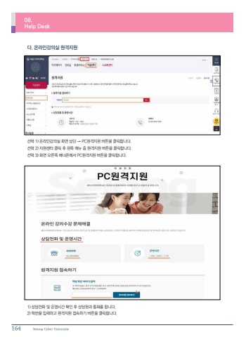 164 Sejong Cyber University%ub2e4. %uc628%ub77c%uc778%uac15%uc758%uc2e4 %uc6d0%uaca9%uc9c0%uc6d0 %uc120%ud0dd 1) %uc628%ub77c%uc778%uac15%uc758%uc2e4 %ud654%uba74 %uc0c1%ub2e8 %u2192 PC%uc6d0%uaca9%uc9c0%uc6d0 %ubc84%ud2bc%uc744 %ud074%ub9ad%ud569%ub2c8%ub2e4.%uc120%ud0dd 2) %uc9c0%uc6d0%uc13c%ud130 %ud074%ub9ad %ud6c4 %uc67c%ucabd %uba54%ub274 %uc911 %uc6d0%uaca9%uc9c0%uc6d0 %ubc84%ud2bc%uc744 %ud074%ub9ad%ud569%ub2c8%ub2e4.%uc120%ud0dd 3) %ud654%uba74 %uc624%ub978%ucabd %ubc30%ub108%uc874%uc5d0%uc11c PC%uc6d0%uaca9%uc9c0%uc6d0 %ubc84%ud2bc%uc744 %ud074%ub9ad%ud569%ub2c8%ub2e4.1) %uc0c1%ub2f4%uc804%ud654 %ubc0f %uc6b4%uc601%uc2dc%uac04 %ud655%uc778 %ud6c4 %uc0c1%ub2f4%uc6d0%uacfc %ud1b5%ud654%ub97c %ud569%ub2c8%ub2e4.2) %ud559%ubc88%uc744 %uc785%ub825%ud558%uace0 %uc6d0%uaca9%uc9c0%uc6d0 %uc811%uc18d%ud558%uae30 %ubc84%ud2bc%uc744 %ud074%ub9ad%ud569%ub2c8%ub2e4.08.Help Desk