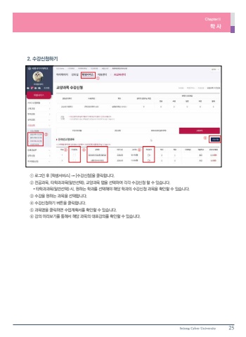 Sejong Cyber University 25Chapter%u2161%ud559 %uc0ac 2. %uc218%uac15%uc2e0%uccad%ud558%uae30 %u2460 %ub85c%uadf8%uc778 %ud6c4 [%ud559%uc0dd%uc11c%ube44%uc2a4] %u2192 [%uc218%uac15%uc2e0%uccad]%uc744 %ud074%ub9ad%ud569%ub2c8%ub2e4. %u2461 %uc804%uacf5%uacfc%ubaa9, %ud0c0%ud559%uacfc%uacfc%ubaa9(%uc77c%ubc18%uc120%ud0dd), %uad50%uc591%uacfc%ubaa9 %ud0ed%uc744 %uc120%ud0dd%ud558%uc5ec %uac01%uac01 %uc218%uac15%uc2e0%uccad %ud560 %uc218 %uc788%uc2b5%ub2c8%ub2e4. %u2022 %ud0c0%ud559%uacfc%uacfc%ubaa9(%uc77c%ubc18%uc120%ud0dd) %uc2dc, %uc6d0%ud558%ub294 %ud559%uacfc%ub97c %uc120%ud0dd%ud574%uc57c %ud574%ub2f9 %ud559%uacfc%uc758 %uc218%uac15%uc2e0%uccad %uacfc%ubaa9%uc744 %ud655%uc778%ud560 %uc218 %uc788%uc2b5%ub2c8%ub2e4. %u2462 %uc218%uac15%uc744 %uc6d0%ud558%ub294 %uacfc%ubaa9%uc744 %uc120%ud0dd%ud569%ub2c8%ub2e4. %u2463 %uc218%uac15%uc2e0%uccad%ud558%uae30 %ubc84%ud2bc%uc744 %ud074%ub9ad%ud569%ub2c8%ub2e4. %u2464 %uacfc%ubaa9%uba85%uc744 %ud074%ub9ad%ud558%uba74 %uc218%uc5c5%uacc4%ud68d%uc11c%ub97c %ud655%uc778%ud560 %uc218 %uc788%uc2b5%ub2c8%ub2e4. %u2465 %uac15%uc758 %ubbf8%ub9ac%ubcf4%uae30%ub97c %ud1b5%ud574%uc11c %ud574%ub2f9 %uacfc%ubaa9%uc758 %ub300%ud45c%uac15%uc758%ub97c %ud655%uc778%ud560 %uc218 %uc788%uc2b5%ub2c8%ub2e4.%u2460%u2461%u2465%u2463%u2462 %u2464