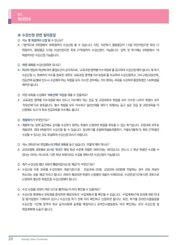 26 Sejong Cyber University%u2299 %uc218%uac15%uc2e0%uccad %uad00%ub828 %uc9c8%uc758%uc751%ub2f5Q : %uc800%ub294 %uba87 %ud559%uc810%uae4c%uc9c0 %uc2e0%uccad %ud560 %uc218 %uc788%ub098%uc694?A : %uae30%ubcf8%uc801%uc73c%ub85c 6%ud559%uc810%uc5d0%uc11c 18%ud559%uc810%uae4c%uc9c0 %uc218%uac15%uc2e0%uccad %ud560 %uc218 %uc788%uc2b5%ub2c8%ub2e4. %ub2e4%ub9cc, %uc9c1%uc804%ud559%uae30 %ud3c9%uc810%ud3c9%uade0%uc774 1.5%uc810 %ubbf8%ub9cc%uc774%uc5c8%uc73c%uba74 %ucd5c%ub300 12%ud559%uc810%uae4c%uc9c0, %ud3c9%uc810%ud3c9%uade0 3.5%uc810 %uc774%uc0c1%uc774%uc5c8%uc73c%uba74 %ucd5c%ub300 27%ud559%uc810%uae4c%uc9c0 %uc218%uac15%uc2e0%uccad%uc774 %uac00%ub2a5%ud569%ub2c8%ub2e4. %uc785%ud559 %uccab %ud559%uae30%uc5d0%ub294 6%ud559%uc810%uc5d0%uc11c 18%ud559%uc810%uae4c%uc9c0%ub9cc %uc218%uac15%uc2e0%uccad %uac00%ub2a5%ud569%ub2c8%ub2e4.Q : %uc5b4%ub5a4 %uacfc%ubaa9%uc744 %uc218%uac15%uc2e0%uccad%ud558%uba74 %ub418%ub098%uc694?A : %ud559%uacfc%uc640 %ud3b8%uc785%ud559 %ud559%ub144%uc5d0 %ub530%ub77c %uc878%uc5c5%uc694%uac74%uc774 %uc0c1%uc774%ud558%ubbc0%ub85c, %u2018%uad50%uc721%uacfc%uc815 %uc601%uc5ed%ubcc4 %uc774%uc218%uacfc%uc815%ud45c%u2019%ub97c %ucc38%uace0%ud558%uc5ec %uc218%uac15%uc2e0%uccad %ud574%uc57c %ud569%ub2c8%ub2e4. %ub9e4 %ud559%uae30 %uc218%uac15%uc2e0%uccad %uc2dc, %ud604%uc7ac%uae4c%uc9c0 %uc774%uc218%ub97c %uc644%ub8cc%ud55c %ub0b4%uc5ed%uacfc %u2018%uad50%uc721%uacfc%uc815 %uc601%uc5ed%ubcc4 %uc774%uc218%uacfc%uc815%ud45c%u2019%ub97c %ube44%uad50%ud558%uc5ec %uc218%uac15%uc2e0%uccad%ud558%uace0, %uc774%uc218%uad6c%ubd84(%uad50%uc591%uc120%ud0dd, %uc804%uacf5%uc120%ud0dd %ub4f1)%ubcc4%ub85c %ubc18%ub4dc%uc2dc %uc218%uac15%ud574%uc57c %ud558%ub294 %ud559%uc810%uc744 %ubaa8%ub450 %uc774%uc218%ud55c %uacbd%uc6b0%uc5d0%ub294 %uae30%ud0c0 %uc6d0%ud558%ub294 %uacfc%ubaa9%uc744 %uc218%uac15%ud558%uc5ec %uc878%uc5c5%ud559%uc810%uc778 140%ud559%uc810%uc744 %ucc44%uc6b0%uba74 %ub429%ub2c8%ub2e4.Q : %uc5b4%ub5a4 %uacfc%ubaa9%uc744 %uc218%uac15%ud574%uc57c %u2018%uc790%uc720%uc120%ud0dd%u2019 %ud559%uc810%uc744 %ucc44%uc6b8 %uc218 %uc788%uc744%uae4c%uc694?A : %u2018%uad50%uc721%uacfc%uc815 %uc601%uc5ed%ubcc4 %uc774%uc218%uacfc%uc815%ud45c%u2019%uc5d0%uc11c %ubc18%ub4dc%uc2dc %uc774%uc218%ud574%uc57c %ud558%ub294 %uc804%uacf5 %ubc0f %uad50%uc591%uacfc%ubaa9%uc758 %ud559%uc810%uc744 %ubaa8%ub450 %uc774%uc218%ud55c %ub098%uba38%uc9c0 %ud559%uc810%uc774 %ubaa8%ub450 %u2018%uc790%uc720%uc120%ud0dd%u2019%uc73c%ub85c %ubd84%ub958%ub429%ub2c8%ub2e4. %ud544%uc218 %ud559%uc810%uc744 %ubaa8%ub450 %uc774%uc218%ud558%uace0 %uc77c%ubc18%uc120%ud0dd%uc744 %ucc44%uc6b0%uae30 %uc704%ud574%uc11c%ub294 %ub4e3%uace0 %uc2f6%uc740 %uc804%uacf5 %ubc0f %uad50%uc591%uacfc%ubaa9%uc744 %ub354 %uc2e0%uccad%ud574%ub3c4 %ub418%uace0 %ud0c0 %ud559%uacfc %uc804%uacf5%uacfc%ubaa9%uc744 %uc774%uc218%ud574%ub3c4 %ub429%ub2c8%ub2e4. Q : %uacc4%uc808%ud559%uae30%uac00 %ubb34%uc5c7%uc778%uac00%uc694?A : %uacc4%uc808%ud559%uae30%ub294 %ubc29%ud559 %ub3d9%uc548%uc5d0%ub3c4 %uac15%uc758%ub97c %uc218%uac15%ud558%uae30 %uc6d0%ud558%ub294 %ud559%uc0dd%uc774 %uc2e0%uccad%ud558%uc5ec %ud559%uc810%uc744 %ucde8%ub4dd%ud560 %uc218 %uc788%ub294 %ud559%uae30%uc785%ub2c8%ub2e4. %uad50%uc591%uacfc%ubaa9 %uc704%uc8fc%ub85c %uac1c%uc124%ub418%uba70, %ucd5c%ub300 9%ud559%uc810%uae4c%uc9c0 %uc218%uac15%uc2e0%uccad %ud560 %uc218 %uc788%uc2b5%ub2c8%ub2e4. %uc815%uaddc%ud559%uae30%ub97c %ud3ec%ud568%ud558%uc5ec(%ubd04&%uc5ec%ub984%ud559%uae30, %uac00%uc744&%uaca8%uc6b8%ud559%uae30) %ucd5c%ub300 27%ud559%uc810%ub9cc %uc218%uac15%ud560 %uc218 %uc788%ub2e4%ub294 %uac83%ub3c4 %uc720%ub150%ud558%uc5ec %uc218%uac15%uc2e0%uccad %ud558%uc2dc%uae30 %ubc14%ub78d%ub2c8%ub2e4.Q : %uc800%ub294 3%ud559%ub144%uc73c%ub85c %ud3b8%uc785%ud588%ub294%ub370 2%ud559%ub144 %uacfc%ubaa9%uc744 %ub4e3%uace0 %uc2f6%uc2b5%ub2c8%ub2e4. %uc5b4%ub5bb%uac8c %ud574%uc57c %ud558%ub098%uc694?A : %uad50%uacfc%uacfc%uc815%uc5d0 %uacfc%ubaa9%ubcc4%ub85c %ud45c%uc2dc%ub41c %ud559%ub144%uc740 %ud574%ub2f9 %ud559%ub144 %uc218%uc900%uc5d0 %uc801%ud569%ud55c %uacfc%ubaa9%uc774%ub77c%ub294 %uc758%ubbf8%uc785%ub2c8%ub2e4. %ubc18%ub4dc%uc2dc %uadf8 %ud559%ub144 %ud559%uc0dd%ub9cc %uc218%uac15%ud560 %uc218 %uc788%ub2e4%ub294 %uc758%ubbf8%ub294 %uc544%ub2c8%ubbc0%ub85c, %ub2e4%ub978 %ud559%ub144 %uacfc%ubaa9%uc774%ub77c%ub3c4 %uc218%uac15%uc744 %uc6d0%ud558%uc2dc%uba74 %uc218%uac15%uc2e0%uccad%uc774 %uac00%ub2a5%ud569%ub2c8%ub2e4.Q : %uc81c%uac00 %uc218%uac15%uc2e0%uccad %ud588%ub358 %uacfc%ubaa9%uc774 %ud3d0%uac15%ub418%uc5c8%ub2e4%ub294%ub370,%u2018%ud3d0%uac15%u2019%uc774 %ubb34%uc5c7%uc778%uac00%uc694?A : %uc218%uac15%uc2e0%uccad %uc774%ud6c4 %uacfc%ubaa9%ubcc4 %uc218%uac15%uc778%uc6d0%uc774 %uac1c%uc124%uae30%uc900(%uae30%uc900 : %uc804%uacf5%uacfc%ubaa9-20%uba85, %uad50%uc591%uacfc%ubaa9-50%uba85)%uc5d0 %ubbf8%ub2ec%ud558%ub294 %uacbd%uc6b0 %uacfc%ubaa9 %uac1c%uc124%uc774 %ucde8%uc18c%ub418%ub294 %uac83%uc744 %u2018%ud3d0%uac15%u2019%uc774%ub77c%uace0 %ud569%ub2c8%ub2e4. %uacfc%ubaa9%uc774 %ud3d0%uac15%ub418%uba74 %ud559%uc0dd%uc774 %uc2e0%uccad%ud588%ub358 %ub0b4%uc6a9%uc774 %uc0ad%uc81c%ub418%ubbc0%ub85c, %uc218%uac15%ubcc0%uacbd%uae30%uac04%uc5d0 %ub2e4%ub978 %uacfc%ubaa9%uc73c%ub85c %uc2e0%uccad%ud558%uc5ec %ud544%uc694%ud55c %ud559%uc810%ub9cc%ud07c %uc218%uac15%uc2e0%uccad%ud574%uc57c %ud569%ub2c8%ub2e4. Q : %uc218%uac15 %uc2e0%uccad%ud560 %uacfc%ubaa9%uc774 %uc5b4%ub5a4 %uc2dd%uc73c%ub85c %ud3c9%uac00%ub418%ub294%uc9c0 %ubbf8%ub9ac %ud655%uc778%ud560 %uc218 %uc788%uc744%uae4c%uc694?A : %uc218%uac15%uc2e0%uccad %ud654%uba74%uc5d0%uc11c %uacfc%ubaa9%uba85%uc744 %ud074%ub9ad%ud558%uba74 %ud574%ub2f9%uacfc%ubaa9%uc758 %u2018%uc218%uc5c5%uacc4%ud68d%uc11c%u2019%ub97c %ud655%uc778%ud560 %uc218 %uc788%uc2b5%ub2c8%ub2e4. %u2018%uc218%uc5c5%uacc4%ud68d%uc11c%u2019%uc5d0 %uac15%uc758%uc5d0 %ub300%ud55c %uc548%ub0b4 %ubc0f %ud3c9%uac00%ubc29%ubc95%uc774 %uae30%uc7ac%ub418%uc5b4 %uc788%uc73c%ub2c8 %uc218%uac15%uc2e0%uccad %ud558%uae30 %uc804%uc5d0 %ubbf8%ub9ac %ud655%uc778%ud558%uace0 %uc2e0%uc