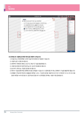 34 Sejong Cyber University 4) %ubaa8%uc758%ud14c%uc2a4%ud2b8 %uc2dc%ud5d8%uc5d0 %uc751%uc2dc%ud558%uba74 %uc704%uc640 %uac19%uc740 %ud654%uba74%uc774 %ub098%ud0c0%ub0a9%ub2c8%ub2e4. %u2460 [%ub2e4%uc74c] %ub610%ub294 [%uc774%uc804]%ubc84%ud2bc%uc744 %ub204%ub974%uba74 %ub2e4%uc74c/%uc774%uc804 %ubb38%ud56d%uc73c%ub85c %uc774%ub3d9%ud560 %uc218 %uc788%uc2b5%ub2c8%ub2e4. %u2461 %uc2dc%ud5d8%uc758 %ub0a8%uc740 %uc2dc%uac04%uc744 %ud45c%uc2dc%ud569%ub2c8%ub2e4. %u2462 %uc67c%ucabd%ubd80%ud130 %ucc28%ub840%ub300%ub85c [%uba54%ubaa8], [%uc120%uae0b%uae30], [%uacc4%uc0b0%uae30] %uae30%ub2a5%uc744 %ud65c%uc131%ud654%ud569%ub2c8%ub2e4. %u2463 %uc2dc%ud5d8%uc758 %ucd1d %ubb38%ud56d%uc218%uc640 %ub2f5%uc548%uc791%uc131%uac00%ub2a5%uc2dc%uac04, %uc751%uc2dc%uc790 %uc815%ubcf4%ub97c %ud45c%uc2dc%ud569%ub2c8%ub2e4. %u2464 %uc751%uc2dc%uc790%uac00 %uc120%ud0dd %ub610%ub294 %uc791%uc131%ud55c %ub2f5%uc548%uc744 %ud45c%uc2dc%ud569%ub2c8%ub2e4. %u2465 %ubd81%ub9c8%ud06c %uae30%ub2a5%uc744 %ud1b5%ud574 %ud2b9%uc815 %ubb38%uc81c%uc5d0 %ud45c%uc2dd%uc744 %ub0a8%uaca8%ub193%uc744 %uc218 %uc788%uc2b5%ub2c8%ub2e4. (%ub098%uc911%uc5d0 %ud480%uace0%uc790 %ud558%ub294 %ubb38%uc81c%uc5d0 %uc774 %uae30%ub2a5%uc744 %ud65c%uc6a9%ud558%uba74 %uc88b%uc2b5%ub2c8%ub2e4) %u2466 %ubb38%uc81c%ub97c %ub2e4 %ud478%uc168%uc73c%uba74 %ud558%ub2e8%uc758 [%uc2dc%ud5d8%uc885%ub8cc] %ubc84%ud2bc%uc744 %ub204%ub974%uace0, %uc791%uc131%ud55c %ub2f5%uc548%uc744 %ucd5c%uc885%uc801%uc73c%ub85c %ud55c %ubc88 %ub354 %ud655%uc778%ud55c %ub4a4 %ub2e4%uc2dc %ud55c %ubc88 [%uc2dc%ud5d8%uc885%ub8cc] %ubc84%ud2bc%uc744 %ub204%ub974%uc2dc%uba74 %ub429%ub2c8%ub2e4. %ub2f5%uc548%uc791%uc131%uc2dc%uac04%uc744 %ubaa8%ub450 %uc18c%uc9c4%ud558%uc600%uc744 %uacbd%uc6b0%uc5d0%ub294 %uc2dc%ud5d8%uc774 %uc790%ub3d9 %uc885%ub8cc%ub429%ub2c8%ub2e4.01.%ud559%uc0ac%uc548%ub0b4