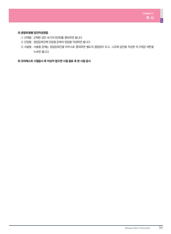 Sejong Cyber University 355) %ubb38%ud56d%uc720%ud615%ubcc4 %ub2f5%uc548%uc791%uc131%ubc29%ubc95 %u2460 %uc120%ud0dd%ud615 : %uc120%ud0dd%ud55c %ub2f5%uc548 %ubcf4%uae30%uc758 [%ubc88%ud638]%ub97c %ud074%ub9ad%ud558%uba74 %ub429%ub2c8%ub2e4. %u2461 %ub2e8%ub2f5%ud615 : %uc815%ub2f5%uc785%ub825%uce78%uc5d0 %ub2e8%ub2f5%ud615 %ubb38%uc81c%uc758 %uc815%ub2f5%uc744 %uc791%uc131%ud558%uba74 %ub429%ub2c8%ub2e4. %u2462 %uc11c%uc220%ud615 : %uc11c%uc220%ud615 %ubb38%uc81c%ub294 %uc815%ub2f5%uc785%ub825%uce78%uc744 %ub9c8%uc6b0%uc2a4%ub85c %ud074%ub9ad%ud558%uba74 %ubcc4%ub3c4%uc758 %ud31d%uc5c5%ucc3d%uc774 %ub728%uace0, %uadf8%uacf3%uc5d0 %ub2f5%uc548%uc744 %uc791%uc131%ud55c %ub4a4 [%uc800%uc7a5] %ubc84%ud2bc%uc744 %ub204%ub974%uba74 %ub429%ub2c8%ub2e4.6) %ubaa8%uc758%ud14c%uc2a4%ud2b8 %uc2dc%ud5d8%uc751%uc2dc %ud6c4 %uc774%uc0c1%uc774 %uc5c6%uc73c%uba74 %uc2dc%ud5d8 %uc885%ub8cc %ud6c4 %ubcf8 %uc2dc%ud5d8 %uc751%uc2dcChapter%u2161%ud559 %uc0ac