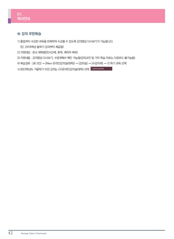 42 Sejong Cyber University%u2299 %uac15%uc758 %ubb34%ud55c%ubcf5%uc2b51) %uc878%uc5c5%uae4c%uc9c0 %uc218%uac15%ud55c %uacfc%ubaa9%uc744 %ubc18%ubcf5%ud558%uc5ec %uc218%uac15%ud560 %uc218 %uc788%ub3c4%ub85d %uac15%uc758%uc601%uc0c1 %ub2e4%uc2dc%ubcf4%uae30%uac00 %uac00%ub2a5%ud569%ub2c8%ub2e4. (%ub2e8, 2018%ud559%ub144 %ubd04%ud559%uae30 %uac15%uc758%ubd80%ud130 %uc81c%uacf5%ud568)2) %uc9c0%uc6d0%ub300%uc0c1 : %ubcf8%uad50 %uc7ac%ud559%uc0dd%ub9cc(%uc2dc%uac04%uc81c, %ud734%ud559, %uc81c%uc801%uc790 %uc81c%uc678)3) %uc9c0%uc6d0%ub0b4%uc6a9 : %uac15%uc758%uc601%uc0c1 %ub2e4%uc2dc%ubcf4%uae30, %uc218%uc5c5%uacc4%ud68d%uc11c %ud655%uc778 %uac00%ub2a5%ud568(%uac15%uc758%uad50%uc548 %ubc0f %uae30%ud0c0 %ud559%uc2b5 %uc790%ub8cc%ub294 %ub2e4%uc6b4%ub85c%ub4dc %ubd88%uac00%ub2a5%ud568)4) %ubcf5%uc2b5%uacbd%ub85c : [%ub85c%uadf8%uc778] %u2192 [New %uc628%ub77c%uc778%uac15%uc758%uc2e4(%ub300%ud559)] %u2192 [%uac15%uc758%uc2e4] %u2192 [%uc218%uac15%uc774%ub825] %u2192 %uac01 %ud559%uae30 %uacfc%ubaa9 %uc120%ud0dd%u203b2023%ud559%ub144%ub3c4 %uac00%uc744%ud559%uae30 %uc774%uc804 %uac15%uc758%ub294 (%uad6c)%uc628%ub77c%uc778%uac15%uc758%uc2e4(%ub300%ud559) %uc120%ud0dd01.%ud559%uc0ac%uc548%ub0b4