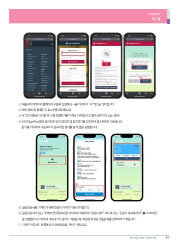 Sejong Cyber University 45Chapter%u2161%ud559 %uc0ac%u2460 %uc138%uc885%uc0ac%uc774%ubc84%ub300%ud559%uad50 %ud648%ud398%uc774%uc9c0 %uc624%ub978%ucabd %uc0c1%ub2e8%uc5d0%uc11c %u2261%ub97c %ud130%uce58%ud558%uace0 %u2018%ub85c%uadf8%uc778%u2019%uc744 %ud130%uce58%ud569%ub2c8%ub2e4.%u2461 %ud559%ubc88 %uc785%ub825 %ud6c4 %ud1b5%ud569%uc778%uc99d %ub85c%uadf8%uc778%uc744 %ud130%uce58%ud569%ub2c8%ub2e4.%u2462 %ub85c%uadf8%uc778 %ubc84%ud2bc%uc744 %ud130%uce58%ud55c %ud6c4 %uc11c%uba85 %uc9c4%ud589%ud558%uae30%ub97c %ucc28%ub840%ub85c %ud130%uce58%ud569%ub2c8%ub2e4.(%uc571%uc774 %uc124%uce58%ub418%uc5b4 %uc788%ub294 %uacbd%uc6b0) %u2463 KICASignPlus%uc571%uc774 %uc124%uce58%ub418%uc5b4 %uc788%uc9c0 %uc54a%ub2e4%uba74 %uc571 %uc124%uce58%ud558%uae30%ub97c %ud130%uce58%ud558%uc5ec %uc571%uc2a4%ud1a0%uc5b4%ub85c %uc774%ub3d9%ud569%ub2c8%ub2e4. %ubc1b%uae30%ub97c %ud130%uce58%ud558%uc5ec %ub2e4%uc6b4%ub85c%ub4dc%uac00 %uc644%ub8cc%ub418%uba74 %uc5f4%uae30%ub97c %ub20c%ub7ec %uc571%uc744 %uc2e4%ud589%ud569%ub2c8%ub2e4.%u2464 %uacf5%ub3d9%uc778%uc99d%uc11c%ub97c %uac00%uc838%uc624%uae30 %uc704%ud574%u2018%uc778%uc99d%uc11c %uac00%uc838%uc624%uae30%u2019%ub97c %ud130%uce58%ud569%ub2c8%ub2e4.%u2465 %uacf5%ub3d9%uc778%uc99d%uc11c%uac00 %uc788%ub294 PC%uc5d0%uc11c%u2018%ud55c%uad6d%uc815%ubcf4%uc778%uc99d%u2019%uc0ac%uc774%ud2b8%ub85c %uc774%ub3d9%ud558%uc5ec %u2018%uc778%uc99d%uc11c%uad00%ub9ac%u2019 %uba54%ub274%uc5d0 %uc788%ub294 %u2018%uc778%uc99d%uc11c %ub0b4%ubcf4%ub0b4%uae30(PC %u25b6 %uc2a4%ub9c8%ud2b8%ud3f0)%u2019%uc744 %uc9c4%ud589%ud569%ub2c8%ub2e4. PC%uc5d0%uc11c %ub0b4%ubcf4%ub0b4%uae30%uac00 %uc900%ube44%uac00 %ub418%uc5c8%uc744 %ub54c, %ud558%ub2e8%uc5d0 %ud45c%uc2dc%ub41c %uc778%uc99d%ubc88%ud638%ub97c %uc785%ub825%ud558%uc5ec %uac00%uc838%uc635%ub2c8%ub2e4.%u2466 %uac00%uc838%uc628 %uc778%uc99d%uc11c%uac00 %ubaa9%ub85d%uc5d0 %ub728%uba74 %uc815%uc0c1%uc801%uc73c%ub85c %uac00%uc838%uc628 %uac83%uc785%ub2c8%ub2e4.