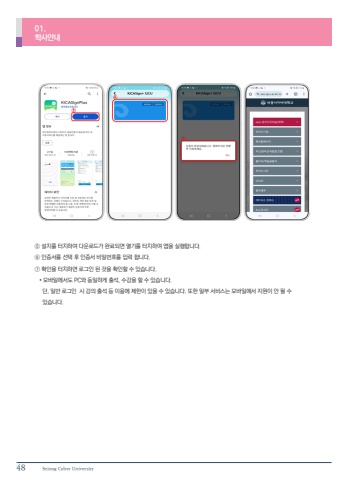 48 Sejong Cyber University01.%ud559%uc0ac%uc548%ub0b4%u2464 %uc124%uce58%ub97c %ud130%uce58%ud558%uc5ec %ub2e4%uc6b4%ub85c%ub4dc%uac00 %uc644%ub8cc%ub418%uba74 %uc5f4%uae30%ub97c %ud130%uce58%ud558%uc5ec %uc571%uc744 %uc2e4%ud589%ud569%ub2c8%ub2e4.%u2465 %uc778%uc99d%uc11c%ub97c %uc120%ud0dd %ud6c4 %uc778%uc99d%uc11c %ube44%ubc00%ubc88%ud638%ub97c %uc785%ub825 %ud569%ub2c8%ub2e4.%u2466 %ud655%uc778%uc744 %ud130%uce58%ud558%uba74 %ub85c%uadf8%uc778 %ub41c %uac83%uc744 %ud655%uc778%ud560 %uc218 %uc788%uc2b5%ub2c8%ub2e4. %u2022 %ubaa8%ubc14%uc77c%uc5d0%uc11c%ub3c4 PC%uc640 %ub3d9%uc77c%ud558%uac8c %ucd9c%uc11d, %uc218%uac15%uc744 %ud560 %uc218 %uc788%uc2b5%ub2c8%ub2e4. %ub2e8, %uc77c%ubc18 %ub85c%uadf8%uc778 %uc2dc %uac15%uc758 %ucd9c%uc11d %ub4f1 %uc774%uc6a9%uc5d0 %uc81c%ud55c%uc774 %uc788%uc744 %uc218 %uc788%uc2b5%ub2c8%ub2e4. %ub610%ud55c %uc77c%ubd80 %uc11c%ube44%uc2a4%ub294 %ubaa8%ubc14%uc77c%uc5d0%uc11c %uc9c0%uc6d0%uc774 %uc548 %ub420 %uc218 %uc788%uc2b5%ub2c8%ub2e4.