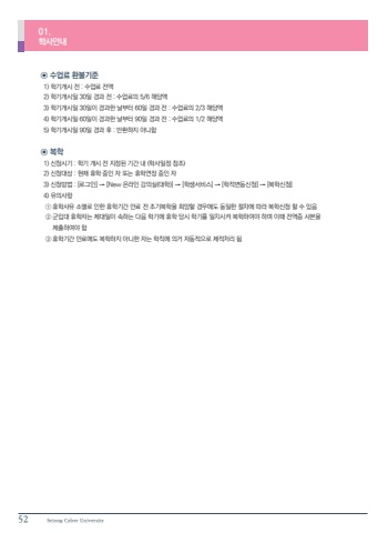 52 Sejong Cyber University01.%ud559%uc0ac%uc548%ub0b4 %u2299 %uc218%uc5c5%ub8cc %ud658%ubd88%uae30%uc900 1) %ud559%uae30%uac1c%uc2dc %uc804 : %uc218%uc5c5%ub8cc %uc804%uc561 2) %ud559%uae30%uac1c%uc2dc%uc77c 30%uc77c %uacbd%uacfc %uc804 : %uc218%uc5c5%ub8cc%uc758 5/6 %ud574%ub2f9%uc561 3) %ud559%uae30%uac1c%uc2dc%uc77c 30%uc77c%uc774 %uacbd%uacfc%ud55c %ub0a0%ubd80%ud130 60%uc77c %uacbd%uacfc %uc804 : %uc218%uc5c5%ub8cc%uc758 2/3 %ud574%ub2f9%uc561 4) %ud559%uae30%uac1c%uc2dc%uc77c 60%uc77c%uc774 %uacbd%uacfc%ud55c %ub0a0%ubd80%ud130 90%uc77c %uacbd%uacfc %uc804 : %uc218%uc5c5%ub8cc%uc758 1/2 %ud574%ub2f9%uc561 5) %ud559%uae30%uac1c%uc2dc%uc77c 90%uc77c %uacbd%uacfc %ud6c4 : %ubc18%ud658%ud558%uc9c0 %uc544%ub2c8%ud568 %u2299 %ubcf5%ud559 1) %uc2e0%uccad%uc2dc%uae30 : %ud559%uae30 %uac1c%uc2dc %uc804 %uc9c0%uc815%ub41c %uae30%uac04 %ub0b4 (%ud559%uc0ac%uc77c%uc815 %ucc38%uc870) 2) %uc2e0%uccad%ub300%uc0c1 : %ud604%uc7ac %ud734%ud559 %uc911%uc778 %uc790 %ub610%ub294 %ud734%ud559%uc5f0%uc7a5 %uc911%uc778 %uc790 3) %uc2e0%uccad%ubc29%ubc95 : [%ub85c%uadf8%uc778] %u2192 [New %uc628%ub77c%uc778 %uac15%uc758%uc2e4(%ub300%ud559)] %u2192 [%ud559%uc0dd%uc11c%ube44%uc2a4] %u2192 [%ud559%uc801%ubcc0%ub3d9%uc2e0%uccad] %u2192 [%ubcf5%ud559%uc2e0%uccad] 4) %uc720%uc758%uc0ac%ud56d %u2460 %ud734%ud559%uc0ac%uc720 %uc18c%uba78%ub85c %uc778%ud55c %ud734%ud559%uae30%uac04 %ub9cc%ub8cc %uc804 %uc870%uae30%ubcf5%ud559%uc744 %ud76c%ub9dd%ud560 %uacbd%uc6b0%uc5d0%ub3c4 %ub3d9%uc77c%ud55c %uc808%ucc28%uc5d0 %ub530%ub77c %ubcf5%ud559%uc2e0%uccad %ud560 %uc218 %uc788%uc74c %u2461 %uad70%uc785%ub300 %ud734%ud559%uc790%ub294 %uc81c%ub300%uc77c%uc774 %uc18d%ud558%ub294 %ub2e4%uc74c %ud559%uae30%uc5d0 %ud734%ud559 %ub2f9%uc2dc %ud559%uae30%ub97c %uc77c%uce58%uc2dc%ucf1c %ubcf5%ud559%ud558%uc5ec%uc57c %ud558%uba70 %uc774%ub54c %uc804%uc5ed%uc99d %uc0ac%ubcf8%uc744 %uc81c%ucd9c%ud558%uc5ec%uc57c %ud568 %u2462 %ud734%ud559%uae30%uac04 %ub9cc%ub8cc%uc5d0%ub3c4 %ubcf5%ud559%ud558%uc9c0 %uc544%ub2c8%ud55c %uc790%ub294 %ud559%uce59%uc5d0 %uc758%uac70 %uc790%ub3d9%uc801%uc73c%ub85c %uc81c%uc801%ucc98%ub9ac %ub428