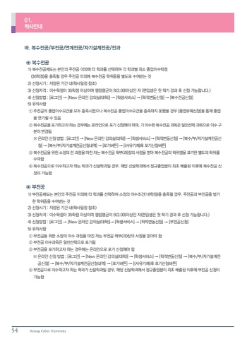 54 Sejong Cyber University01.%ud559%uc0ac%uc548%ub0b4%ubc14. %ubcf5%uc218%uc804%uacf5/%ubd80%uc804%uacf5/%uc5f0%uacc4%uc804%uacf5/%uc790%uae30%uc124%uacc4%uc804%uacf5/%uc804%uacfc %u2299 %ubcf5%uc218%uc804%uacf5 1) %ubcf5%uc218%uc804%uacf5%uc81c%ub3c4%ub294 %ubcf8%uc778%uc758 %uc8fc%uc804%uacf5 %uc774%uc678%uc5d0 %ud0c0 %ud559%uacfc%ub97c %uc120%ud0dd%ud558%uc5ec %uac01 %ud559%uacfc%ubcc4 %ucd5c%uc18c %uc878%uc5c5%uc774%uc218%ud559%uc810 (36%ud559%uc810)%uc744 %ucda9%uc871%ud560 %uacbd%uc6b0 %uc8fc%uc804%uacf5 %uc774%uc678%uc5d0 %ubcf5%uc218%uc804%uacf5 %ud559%uc704%uc99d%uc744 %ubcc4%ub3c4%ub85c %uc218%uc5ec%ubc1b%ub294 %uac83 2) %uc2e0%uccad%uc2dc%uae30 : %uc9c0%uc815%ub41c %uae30%uac04 %ub0b4(%ud559%uc0ac%uc77c%uc815 %ucc38%uc870) 3) %uc2e0%uccad%uc790%uaca9 : %uc774%uc218%ud559%uc810%uc774 35%ud559%uc810 %uc774%uc0c1%uc774%uba70 %ud3c9%uc810%ud3c9%uade0%uc774 B(3.00)%uc774%uc0c1%uc778 %uc790 (%ud3b8%uc785%uc0dd%uc740 %uccab %ud559%uae30 %uacbd%uacfc %ud6c4 %uc2e0%uccad %uac00%ub2a5%ud569%ub2c8%ub2e4.) 4) %uc2e0%uccad%ubc29%ubc95 : [%ub85c%uadf8%uc778] %u2192 [New %uc628%ub77c%uc778 %uac15%uc758%uc2e4(%ub300%ud559)] %u2192 [%ud559%uc0dd%uc11c%ube44%uc2a4] %u2192 [%ud559%uc801%ubcc0%ub3d9%uc2e0%uccad] %u2192 [%ubcf5%uc218%uc804%uacf5%uc2e0%uccad] 5) %uc720%uc758%uc0ac%ud56d %u2460 %uc8fc%uc804%uacf5%uc758 %uc878%uc5c5%uc774%uc218%uc694%uac74%uc744 %ubaa8%ub450 %ucda9%uc871%uc2dc%ucf30%uc73c%ub098 %ubcf5%uc218%uc804%uacf5 %uc878%uc5c5%uc774%uc218%uc694%uac74%uc744 %ucda9%uc871%ud558%uc9c0 %ubabb%ud588%uc744 %uacbd%uc6b0 [%uc878%uc5c5%uc720%uc608%uc2e0%uccad]%uc744 %ud1b5%ud574 %uc878%uc5c5%uc744 %uc5f0%uae30%ud560 %uc218 %uc788%uc74c %u2461 %ubcf5%uc218%uc804%uacf5%uc744 %ud3ec%uae30%ud558%uace0%uc790 %ud558%ub294 %uacbd%uc6b0%uc5d0%ub294 %uc628%ub77c%uc778%uc73c%ub85c %ud3ec%uae30 %uc2e0%uccad%ud574%uc57c %ud558%uba70, %uae30 %uc774%uc218%ud55c %ubcf5%uc218%uc804%uacf5 %uacfc%ubaa9%uc740 %uc77c%ubc18%uc120%ud0dd %uacfc%ubaa9%uc73c%ub85c %uc774%uc218 %uad6c%ubd84%uc774 %ubcc0%uacbd%ub428 %u203b %uc628%ub77c%uc778 %uc2e0%uccad %ubc29%ubc95 : [%ub85c%uadf8%uc778] %u2192 [New %uc628%ub77c%uc778 %uac15%uc758%uc2e4(%ub300%ud559)] %u2192 [%ud559%uc0dd%uc11c%ube44%uc2a4] %u2192 [%ud559%uc801%ubcc0%ub3d9%uc2e0%uccad] %u2192 [%ubcf5%uc218/%ubd80/%uc790%uae30%uc124%uacc4%uc804%uacf5%uc2e0%uccad] %u2192 [%ubcf5%uc218/%ubd80/%uc790%uae30%uc124%uacc4%uc804%uacf5%uc2e0%uccad%ub0b4%uc5ed] %u2192 [%ud3ec%uae30%ubc84%ud2bc] %u2192 [(%uc0ac%uc720%uae30%uc7ac)%ud6c4 %ud3ec%uae30%uc2e0%uccad%ubc84%ud2bc] %u2462 %ubcf5%uc218%uc804%uacf5%uc744 %uc704%ud55c %uc18c%uc815%uc758 %uc804 %uacfc%uc815%uc744 %ub9c8%uce5c %uc790%ub294 %ubcf5%uc218%uc804%uacf5 %ud559%ubd80(%uacfc)%uc7a5%uc758 %uc0ac%uc815%uc744 %ubc1b%uc544 %ubcf5%uc218%uc804%uacf5%uc758 %ud559%uc704%uba85%uc744 %ud45c%uae30%ud55c %ubcc4%ub3c4%uc758 %ud559%uc704%ub97c %uc218%uc5ec%ud568 %u2463 %ubcf5%uc218%uc804%uacf5%uc73c%ub85c %uc774%uc218%ud558%uace0%uc790 %ud558%ub294 %ud559%uacfc%uac00 %uc2e0%uc124%ud559%uacfc%uc77c %uacbd%uc6b0, %ud574%ub2f9 %uc2e0%uc124%ud559%uacfc%uc5d0%uc11c %uc815%uaddc%uc878%uc5c5%uc0dd%uc774 %ucd5c%ucd08 %ubc30%ucd9c%ub41c %uc774%ud6c4%uc5d0 %ubcf5%uc218%uc804%uacf5 %uc2e0%uccad%uc774 %uac00%ub2a5%ud568 %u2299 %ubd80%uc804%uacf5 1) %ubd80%uc804%uacf5%uc81c%ub3c4%ub294 %ubcf8%uc778%uc758 %uc8fc%uc804%uacf5 %uc774%uc678%uc5d0 %ud0c0 %ud559%uacfc%ub97c %uc120%ud0dd%ud558%uc5ec %uc18c%uc815%uc758 %uc774%uc218%uc870%uac74(18%ud559%uc810)%uc744 %ucda9%uc871%ud560 %uacbd%uc6b0, %uc8fc%uc804%uacf5%uacfc %ubd80%uc804%uacf5%uc744 %ubcd1%uae30%ud55c %ud559%uc704%uc99d%uc744 %uc218%uc5ec%ubc1b%ub294 %uac83 2) %uc2e0%uccad%uc2dc%uae30 : %uc9c0%uc815%ub41c %uae30%uac04 %ub0b4(%ud559%uc0ac%uc77c%uc815 %ucc38%uc870) 3) %uc2e0%uccad%uc790%uaca9 : %uc774%uc218%ud559%uc810%uc774 35%ud559%uc810 %uc774%uc0c1%uc774%uba70 %ud3c9%uc810%ud3c9%uade0%uc774 B(3.00)%uc774%uc0c1%uc778 %uc790(%ud3b8%uc785%uc0dd%uc740 %uccab %ud559%uae30 %uacbd%uacfc %ud6c4 %uc2e0%uccad %uac00%ub2a5%ud569%ub2c8%ub2e4.) 4) %uc2e0%uccad%ubc29%ubc95 : [%ub85c%uadf8%uc778] %u2192 [New %uc628%ub77c%uc778 %uac15%uc758%uc2e4(%ub300%ud559)]%u2192 [%ud559%uc0dd%uc11c%ube44%uc2a4] %u2192 [%ud559%uc801%ubcc0%ub3d9%uc2e0%uccad] %u2192 [%ubd80%uc804%uacf5%uc2e0%uccad] 5) %uc720%uc758%uc0ac%ud56d %u2460 %ubd80%uc804%uacf5%uc744 %uc704%ud55c %uc18c%uc815%uc758 %uc774%uc218 %uacfc%uc815%uc744 %ub9c8%uce5c %uc790%ub294 %ubd80%uc804%uacf5 %ud559%ubd80(%uacfc)%uc7a5%uc758 %uc0ac%uc815%uc744 %ubc1b%uc544%uc57c %ud568 %u2461 %ubd80%uc804%uacf5 %uc774%uc218%uacfc%ubaa9%uc740 %uc77c%ubc18%uc120%ud0dd%uc73c%ub85c %ud45c%uae30%ub428 %u2462 %ubd80%uc804%uacf5%uc744 %ud3ec%uae30%ud558%uace0%uc790 %ud558%ub294 %uacbd%uc6b0%uc5d0%ub294 %uc628%ub77c%uc778%uc73c%ub85c %ud3ec%uae30 %uc2e0%uccad%ud574%uc57c %ud568 %u203b %uc628%ub77c%uc778 %uc2e0%uccad %ubc29%ubc95 : [%ub85c%uadf8%uc778] %u2192 [New %uc628%ub77c%uc778 %uac15%uc758%uc2e4(%ub300%ud559)] %u2192 [%ud559%uc0dd%uc11c%ube44%uc2a4] %u2192 [%ud559%uc801%ubcc0%ub3d9%uc2e0%uccad] %u2192 [%ubcf5%uc218/%ubd80/%uc790%uae30%uc124%uacc4%uc804%uacf5%uc2e0%uccad] %u2192 [%ubcf5%uc218/%ubd80/%uc790%uae30%uc124%uacc4%uc804%uacf5%uc2e0%uccad%ub0b4%uc5ed] %u2192 [%ud3ec%uae30%ubc84%ud2bc] %u2192 [(%uc0ac%uc720%uae30%uc7ac)%ud6c4 %ud3ec%uae30%uc2e0%uccad%ubc84%ud2bc] %u2463 %ubd80%uc804%uacf5%uc73c%ub85c %uc774%uc218%ud558%uace0%uc790 %ud558%ub294 %ud559%uacfc%uac00 %uc2e0%uc124%ud559%uacfc%uc77c %uacbd%uc6b0, %ud574%ub2f9 %uc2e0%uc124%ud559%uacfc%uc5d0%uc11c %uc815%uaddc%uc878%uc5c5%uc0dd%uc774 %ucd5c%ucd08 %ubc30%ucd9c%ub41c %uc774%ud6c4%uc5d0 %ubd80%uc804%uacf5 %uc2e0%uccad%uc774 %uac00%ub2a5%ud568