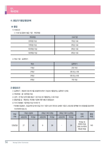 56 Sejong Cyber University%uc0ac. %uc878%uc5c5/%uc870%uae30%uc878%uc5c5/%uc878%uc5c5%uc720%uc608 %u2299 %uc878%uc5c51) %uc218%ub8cc%uc694%uac74 %u2460 %uc218%ub8cc %ubc0f %uc99d%uba85%uc11c %ubc1c%uae09 %uae30%uc900 : %ucde8%ub4dd%ud559%uc810%u2461 %ud559%ub144 %uae30%uc900 : %ub4f1%ub85d%ud559%uae30 2) %uc878%uc5c5%uc694%uac74%u2460 %ub4f1%ub85d%ud559%uae30 : %ud3b8%uc785%ud559 %uc778%uc815 %ud559%uae30%ub97c %ud3ec%ud568%ud558%uc5ec 8%ud559%uae30 %uc774%uc0c1(%uc870%uae30%uc878%uc5c5%uc790%ub294 %ub4f1%ub85d%ud559%uae30 %ub2e8%ucd95)%u2461 %ucde8%ub4dd%ud559%uc810 : %ucd1d 140%ud559%uc810 %uc774%uc0c1%u2462 %uc131%uc801 : %uc804 %ud559%ub144 %uc131%uc801 %ud3c9%uc810 %ud3c9%uade0 1.50 %uc774%uc0c1 (%uc870%uae30%uc878%uc5c5%uc790%ub294 3.50 %uc774%uc0c1) %u2463 %uc878%uc5c5%uc791%ud488 %ub4f1 : %ud574%ub2f9%ub418%ub294 %ud559%uacfc%ubcc4 %uae30%uc900%uc5d0 %ub530%ub978 %ubcc4%ub3c4%uc758 %uc878%uc5c5%uc2ec%uc0ac%u2464 %uc774%uc218%uad6c%ubd84%ubcc4%ub85c %uae30%uc900%ud559%uc810 %uc774%uc0c1 %uc774%uc218%ud55c %uc790 %u2022 %ud559%uacfc%ubcc4 %uc804%uacf5%ud544%uc218, %uc804%uacf5%uc120%ud0dd %ubc0f %ubcf5%uc218%uc804%uacf5 %uc774%uc218 %uae30%uc900%uc774 %uc0c1%uc774 %ud558%ubbc0%ub85c %uc0c1%uc138%ud55c %uae30%uc900%uc740 %uad50%uc721%uacfc%uc815 %uc601%uc5ed%ubcc4 %uc774%uc218%uacfc%uc815%ud45c%ub97c %ucc38%uc870%ud558%uc5ec %uc774%uc218%ud558%uc5ec%uc57c %ud569%ub2c8%ub2e4.%ucde8%ub4dd%ud559%uc810 %uc218%ub8cc%uae30%uc90035%ud559%uc810 %uc774%uc0c1 1%ud559%ub144 %uc218%ub8cc70%ud559%uc810 %uc774%uc0c1 2%ud559%ub144 %uc218%ub8cc105%ud559%uc810 %uc774%uc0c1 3%ud559%ub144 %uc218%ub8cc140%ud559%uc810 %uc774%uc0c1 4%ud559%ub144 %uc218%ub8cc%ud559%ub144 %ub4f1%ub85d%ud559%uae301%ud559%ub144 2%ud68c %uc774%ub0b42%ud559%ub144 3%ud68c %ub610%ub294 4%ud68c3%ud559%ub144 5%ud68c %ub610%ub294 6%ud68c4%ud559%ub144 7%ud68c %uc774%uc0c1%uc804%uacf5%uad6c%ubd841%ud559%ub144 %uc2e0%uc785%ud559 2%ud559%ub144 1%ud559%uae30 %ud3b8%uc785 3%ud559%ub144 1%ud559%uae30 %uc2e0/%ud3b8%uc785 %uc790%uc720%uc120%ud0dd%uc878%uc5c5%ud559%uc810 %uad50%uc591%uc120%ud0dd %uc8fc%uc804%uacf5 %uad50%uc591%uc120%ud0dd %uc8fc%uc804%uacf5 %uad50%uc591%uc120%ud0dd %uc8fc%uc804%uacf5%ub2e8%uc77c%uc804%uacf5 27 45 9 36 - 24%uc8fc%uc804%uacf5 %uc678 %ud0c0%ud559%uacfc %uc804%uacf5%uacfc%ubaa9 %uc774%uc218%ud558%uc5ec %ucde8%ub4dd%ud55c %ud559%uc81014001.%ud559%uc0ac%uc548%ub0b4
