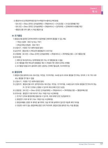 Sejong Cyber University 57 %u2465 %uc878%uc5c5%uc774%uc218%uc694%uac74/%ud3b8%uc785%ud559%ud559%uc810%uc778%uc815/%uc774%uc218%ud559%uc810/%uc774%uc218%ucd1d%uacc4 %ub4f1 %ud655%uc778%ubc29%ubc95 %u2022 [%ub85c%uadf8%uc778] %u2192 [New %uc628%ub77c%uc778 %uac15%uc758%uc2e4(%ub300%ud559)] %u2192 [%ud559%uc0dd%uc11c%ube44%uc2a4] %u2192 [%uc218%uac15%uc2e0%uccad] %u2192 [%uc218%uac15%uc2e0%uccad%ud604%ud669] %ud558%ub2e8 %u2022 [%ub85c%uadf8%uc778] %u2192 [New %uc628%ub77c%uc778 %uac15%uc758%uc2e4(%ub300%ud559)] %u2192 [%ud559%uc0dd%uc11c%ube44%uc2a4] %u2192 [%uc131%uc801%uc870%ud68c] %u2192 [%uc804%uccb4%uacfc%ubaa9%uc774%uc218%ud604%ud669] %ud558%ub2e8 %u2022 %uc878%uc5c5%uc694%uac74%uc744 %ubaa8%ub450 %ucda9%uc871 %uc2dc %uc790%ub3d9 %uc878%uc5c5%uc774 %ub428 %u2299 %uc870%uae30%uc878%uc5c51) %uc878%uc5c5%uc694%uac74%uc744 %ucda9%uc871%ud55c %uacbd%uc6b0%uc5d0 %ud55c%ud558%uc5ec %uc218%uc5c5%uc5f0%ud55c%uc744 %ub2e8%ucd95%ud558%uc5ec %uc878%uc5c5%ud560 %uc218 %uc788%ub294 %uc81c%ub3c4 %u2022 1%ud559%ub144 %uc2e0%uc785%ud559 : %ucd5c%ub300 1%ub144 %ub610%ub294 1%ud559%uae30 %u2022 2%ud559%ub144/3%ud559%ub144 %ud3b8%uc785%ud559 : %ucd5c%ub300 1%ud559%uae302) %uc2e0%uccad%uc2dc%uae30 : %uc9c0%uc815%ub41c %uae30%uac04 %ub0b4(%ud559%uc0ac%uc77c%uc815 %ucc38%uc870)3) %uc2b9%uc778%uc790%uaca9 : %uc878%uc5c5%uc0ac%uc815 %uc2dc %ucde8%ub4dd%uc131%uc801 %ud3c9%uc810%ud3c9%uade0%uc774 3.50 %uc774%uc0c14) %uc2e0%uccad%ubc29%ubc95 : [%ub85c%uadf8%uc778] %u2192 [New %uc628%ub77c%uc778 %uac15%uc758%uc2e4(%ub300%ud559)] %u2192 [%ud559%uc0dd%uc11c%ube44%uc2a4] %u2192 [%ud559%uc801%ubcc0%ub3d9%uc2e0%uccad] %u2192 [%uc870%uae30%uc878%uc5c5%uc2e0%uccad]5) %uc720%uc758%uc0ac%ud56d %u2460 %uc7ac%ud559 %uc911 %ud559%uc0ac%uc9d5%uacc4 %ub610%ub294 %uc9d5%uacc4%ucc98%ubd84%uc744 %ubc1b%uc740 %uc790%ub294 %uc870%uae30%uc878%uc5c5%uc744 %ud560 %uc218 %uc5c6%uc74c %u2461 %uc870%uae30%uc878%uc5c5%uc744 %uc704%ud55c %ucde8%ub4dd%uc131%uc801 %ud3c9%uc810%ud3c9%uade0 %uacc4%uc0b0 %uc2dc %ud559%uc810%ud3ec%uae30%ud55c %uacfc%ubaa9%uc758 %uc131%uc801%ub3c4 %ubc18%uc601%ud568 %u2462 %uc870%uae30%uc878%uc5c5%uae30%uc900%uc744 %ubaa8%ub450 %ucda9%uc871%ud558%uc9c0 %ubabb%ud55c %uc2e0%uccad%uc790%ub294 %uc794%uc5ec%ud559%uae30%ub97c %ub4f1%ub85d, %uc774%uc218%ud558%uc5ec%uc57c %ud568 %u2299 %uc878%uc5c5%uc720%uc6081) %uc878%uc5c5%uc694%uac74%uc744 %ucda9%uc871%ud558%uace0%uc11c%ub3c4 %ubcf5%uc218%uc804%uacf5, %ubd80%uc804%uacf5, %uad6d%uac00%uc790%uaca9%uc99d, %uc218%ub8cc%uc99d %ub4f1%uc758 %uc0ac%uc720%ub85c %uc878%uc5c5%uc744 %uc5f0%uae30%ud558%ub294 %uac83%uc774%uba70 %uadf8 %uc678 %uae30%ud0c0 %uc0ac%uc720%ub85c%ub294 %uc878%uc5c5%uc744 %uc5f0%uae30%ud560 %uc218 %uc5c6%uc74c2) %uc2e0%uccad%uc2dc%uae30 : %uc9c0%uc815%ub41c %uae30%uac04 %ub0b4(%ud559%uc0ac%uc77c%uc815 %ucc38%uc870)3) %uc2e0%uccad%uc790%uaca9 : %uc878%uc5c5%uc694%uac74%uc744 %ubaa8%ub450 %uac16%ucd94%uc5c8%ub354%ub77c%ub3c4 %ubcf5%uc218%uc804%uacf5, %ubd80%uc804%uacf5, %uad6d%uac00%uc790%uaca9%uc99d, %uc218%ub8cc%uc99d %ub4f1%uc758 %uc774%uc720%ub85c %uc878%uc5c5%uc744 %uc5f0%uae30%ud558%uace0%uc790 %ud558%ub294 %uc790. %ud55c %ud559%uae30 %ub2e8%uc704%ub85c %uc2e0%uccad%ud560 %uc218 %uc788%uc73c%uba70 %ucd5c%ub300 %uc720%uc608%uae30%uac04%uc740 3%ub144%uc7844) %uc2e0%uccad%ubc29%ubc95 : [%ub85c%uadf8%uc778] %u2192 [New %uc628%ub77c%uc778 %uac15%uc758%uc2e4(%ub300%ud559)] %u2192 [%ud559%uc0dd%uc11c%ube44%uc2a4] %u2192 [%ud559%uc801%ubcc0%ub3d9%uc2e0%uccad] %u2192 [%uc878%uc5c5%uc720%uc608%uc2e0%uccad]5) %uc720%uc758%uc0ac%ud56d : %uc878%uc5c5%uc5f0%uae30 %uc774%ud6c4 %ub9e4 %ud559%uae30 %ucd5c%uc18c 1%ud559%uc810 %uc774%uc0c1 %uc218%uac15%ud574%uc57c%ud568 %u2460 %ud55c %ud559%uae30 %ub2e8%uc704%ub85c %uc878%uc5c5%uc720%uc608%uc2e0%uccad%uc744 %ud560 %uc218 %uc788%uc73c%uba70, %ucd5c%ub300 %uc720%uc608%uae30%uac04%uc740 3%ub144%uc784(6%ud559%uae30) %u2461 %uc878%uc5c5%uc5f0%uae30 %uc774%ud6c4 %ub9e4 %ud559%uae30 %ucd5c%uc18c 1%ud559%uc810 %uc774%uc0c1 %uc218%uac15%ud574%uc57c%ud568 %u2462 %uc878%uc5c5%uc720%uc608%ub97c %uc2e0%uccad%ud55c %ud6c4 %ud734%ud559%uc740 %ubd88%uac00%ud558%uba70, %ub2e4%uc74c %ud559%uae30%uc5d0 %ub4f1%ub85d%ud558%uc9c0 %uc54a%uc73c%uba74 %ubbf8%ub4f1%ub85d %uc81c%uc801 %ucc98%ub9ac%ub428 %u2463 %uc815%ub2f9%ud55c %uc0ac%uc720%uac00 %uc5c6%ub294 %uc878%uc5c5%uc720%uc608%uc2e0%uccad%uc740 %ubc18%ub824 %ucc98%ub9ac%ub418%uba70, %uc878%uc5c5%uc694%uac74%uc744 %ucda9%uc871%ud55c %uc790%ub294 %uc790%ub3d9 %uc878%uc5c5%ub428Chapter%u2161%ud559 %uc0ac