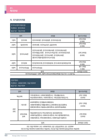 60 Sejong Cyber University01.%ud559%uc0ac%uc548%ub0b4%uc790. %uad6d%uac00%uacf5%uc778%uc790%uaca9%uc99d%ud55c%uad6d%uc5b4%uad50%uc6d0%uc790%uaca9%uc99d(2%uae09)%uc8fc%uad00%ud559%uacfc : %ud55c%uad6d%uc5b4%ud559%uacfc%ubc1c%uae09%uae30%uad00 : %uad6d%ub9bd%uad6d%uc5b4%uc6d0%uac74%uac15%uac00%uc815%uc0ac%uc8fc%uad00%ud559%uacfc : %uc0ac%ud68c%ubcf5%uc9c0%ud559%ubd80, %uc544%ub3d9%uac00%uc871%ud559%ubd80 %ubc1c%uae09%uae30%uad00 : %uc5ec%uc131%uac00%uc871%ubd80%uc601%uc5ed %uacfc%ubaa9%uba85 %ud544%uc218%uc774%uc218%ud559%uc8101%uc601%uc5ed %ud55c%uad6d%uc5b4%ud559 %ud55c%uad6d%uc5b4%ud559%uac1c%ub860, %ud55c%uad6d%uc5b4%ubb38%ubc95%ub860, %ud55c%uad6d%uc5b4%uc5b4%ubb38%uaddc%ubc94 %uc120%ud0dd 6%ud559%uc810(2%uacfc%ubaa9)2%uc601%uc5ed %uc77c%ubc18%uc5b8%uc5b4%ud559 %uc5b8%uc5b4%ud559%uac1c%ub860, %uc678%uad6d%uc5b4%uc2b5%ub4dd%ub860, %uc751%uc6a9%uc5b8%uc5b4%ud559 %uc120%ud0dd 6%ud559%uc810(2%uacfc%ubaa9)3%uc601%uc5ed %ud55c%uad6d%uc5b4%uad50%uc721%ub860%ud55c%uad6d%uc5b4%uad50%uc721%uac1c%ub860, %ud55c%uad6d%uc5b4%uc774%ud574%uad50%uc721%ub860, %ud55c%uad6d%uc5b4%uc5b4%ud718%uad50%uc721%ub860, %ud55c%uad6d%uc5b4%ubc1c%uc74c%uad50%uc721%ub860, %ud55c%uad6d%uc5b4%uad50%uc218%ud559%uc2b5%uc774%ub860, %ud55c%uad6d%uc5b4%ud45c%ud604%uad50%uc721%ub860, %ud55c%uad6d%uc5b4%ubb38%ubc95%uad50%uc721%ub860, %ud55c%uad6d%uc5b4%uad50%uc7ac%ub860, %ud55c%uad6d%ubb38%ud654%uad50%uc721%ub860,%uba40%ud2f0%ubbf8%ub514%uc5b4%ub97c%uc774%uc6a9%ud55c%ud55c%uad6d%uc5b4%uad50%uc218%ubc29%ubc95%uc120%ud0dd 24%ud559%uc810(8%uacfc%ubaa9)4%uc601%uc5ed %ud55c%uad6d%ubb38%ud654 %ud55c%uad6d%ubb38%ud559%uc758%uc774%ud574, %ud55c%uad6d%uc758%ud604%ub300%ubb38%ud654, %ud55c%uad6d%uc0ac%ud68c%uc758%ub2e4%ubb38%ud654%ud604%uc0c1%uc774%ud574 %uc120%ud0dd 6%ud559%uc810(2%uacfc%ubaa9)5%uc601%uc5ed %ud55c%uad6d%uc5b4%uad50%uc721%uc2e4%uc2b5 %ud55c%uad6d%uc5b4%uad50%uc721%uc2e4%uc2b5 %ud544%uc218 3%ud559%uc810(1%uacfc%ubaa9)%ud569%uacc4 45%ud559%uc810(15%uacfc%ubaa9)%ud55c%uad6d%uc5b4%uad50%uc721%uc2e4%uc2b5%uc740 1%uc601%uc5ed, 3%uc601%uc5ed %uacfc%ubaa9 %uc911 8%uacfc%ubaa9(24%ud559%uc810) %uc774%uc0c1 %uc774%uc218 %uc2dc %uc2e0%uccad%uac00%ub2a5%uc601%uc5ed %uacfc%ubaa9%uba85 %ud544%uc218%uc774%uc218%ud559%uc810%ud575%uc2ec%uacfc%ubaa9 %uac00%uc871%uacfc%ubb38%ud654(%uad50), %uc0ac%ud68c%ubcf5%uc9c0%ud589%uc815%ub860(%uc0ac), %uac00%uc871%uc0dd%ud65c%uad50%uc721(%uad50), %uc5ec%uc131%uacfc%ud604%ub300%uc0ac%ud68c(%uc544), %uac00%uc871%ubcf5%uc9c0%ub860(%uc0ac), %uac00%uc871%uc0c1%ub2f4%ubc0f%uce58%ub8cc(%uc0c1/%uc0ac), %uc120%ud0dd 15%ud559%uc810(5%uacfc%ubaa9)%uad00%ub828%uacfc%ubaa9%uae30%ucd08%uc774%ub860%ubcf4%uc721%ud559%uac1c%ub860(%uc544), %uc778%uac04%ud589%ub3d9%uacfc%uc0ac%ud68c%ud658%uacbd(%uc0ac), %uc0ac%ud68c%ubcf5%uc9c0%ud559%uac1c%ub860(%uc0ac), %uc790%uc6d0%ubd09%uc0ac%ub860(%uc0ac), %ub178%uc778%ubcf5%uc9c0%ub860(%uc0ac), %uc815%uc2e0%uac74%uac15%ub860(%uc0ac), %uc7a5%uc560%uc778%ubcf5%uc9c0%ub860(%uc0ac), %uc544%ub3d9(%uccad%uc18c%ub144)%ubcf5%uc9c0%ub860(%uc0ac), %uc0c1%ub2f4%uc774%ub860%uacfc%uc2e4%uc81c(%uc0c1)%uc120%ud0dd 12%ud559%uc810(4%uacfc%ubaa9)%uc0c1%ub2f4%uad50%uc721%ub4f1%uc2e4%uc81c%uc544%ub3d9%uc0c1%ub2f4(%uc544/%uc0c1/%uc0ac), %ubd80%ubaa8%uad50%uc721(%uc544/%uc0c1), %uc9d1%ub2e8%uc0c1%ub2f4(%uc544/%uc0c1), %uc0ac%ud68c%ubcf5%uc9c0%uc2e4%ucc9c%ub860(%uc0ac), %uc0ac%ud68c%ubcf5%uc9c0%uc870%uc0ac%ub860(%uc0ac), %ud504%ub85c%uadf8%ub7a8%uac1c%ubc1c%uacfc%ud3c9%uac00(%uc0ac), %uc0ac%ub840%uad00%ub9ac%ub860(%uc0ac), %uc9c0%uc5ed%uc0ac%ud68c%ubcf5%uc9c0%ub860(%uc0ac), %uc0ac%ud68c%ubcf5%uc9c0%uc2e4%ucc9c%uae30%uc220%ub860(%uc0ac)%uc120%ud0dd 9%ud559%uc810(3%uacfc%ubaa9)%ud569%uacc4 36%ud559%uc810(12%uacfc%ubaa9)(%uc544): %uc544%ub3d9%uac00%uc871%ud559%ubd80, (%uc0ac): %uc0ac%ud68c%ubcf5%uc9c0%ud559%uacfc, (%uc0c1): %uc0c1%ub2f4%uc2ec%ub9ac%ud559%uacfc, (%uad50): %uad50%uc591%ud559%ubd80(%uc544/%uc0ac):%uc544%ub3d9%uac00%uc871%ud559%ubd80/%uc0ac%ud68c%ubcf5%uc9c0%ud559%uacfc %uac1c%uc124%uacfc%ubaa9, (%uc544/%uc0c1):%uc544%ub3d9%uac00%uc871%ud559%ubd80/%uc0c1%ub2f4%uc2ec%ub9ac%ud559%uacfc %uac1c%uc124%uacfc%ubaa9
