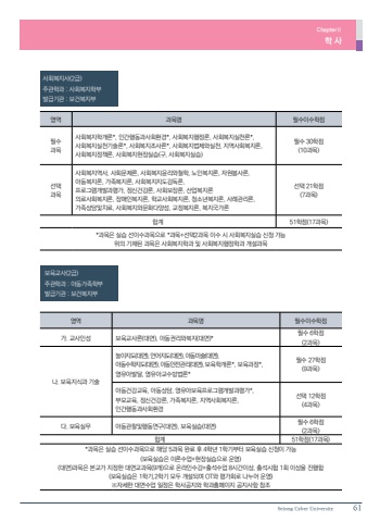 Sejong Cyber University 61Chapter%u2161%ud559 %uc0ac%uc0ac%ud68c%ubcf5%uc9c0%uc0ac(2%uae09)%uc8fc%uad00%ud559%uacfc : %uc0ac%ud68c%ubcf5%uc9c0%ud559%ubd80 %ubc1c%uae09%uae30%uad00 : %ubcf4%uac74%ubcf5%uc9c0%ubd80 %ubcf4%uc721%uad50%uc0ac(2%uae09) %uc8fc%uad00%ud559%uacfc : %uc544%ub3d9%uac00%uc871%ud559%ubd80 %ubc1c%uae09%uae30%uad00 : %ubcf4%uac74%ubcf5%uc9c0%ubd80%uc601%uc5ed %uacfc%ubaa9%uba85 %ud544%uc218%uc774%uc218%ud559%uc810%ud544%uc218%uacfc%ubaa9%uc0ac%ud68c%ubcf5%uc9c0%ud559%uac1c%ub860*, %uc778%uac04%ud589%ub3d9%uacfc%uc0ac%ud68c%ud658%uacbd*, %uc0ac%ud68c%ubcf5%uc9c0%ud589%uc815%ub860, %uc0ac%ud68c%ubcf5%uc9c0%uc2e4%ucc9c%ub860*, %uc0ac%ud68c%ubcf5%uc9c0%uc2e4%ucc9c%uae30%uc220%ub860*, %uc0ac%ud68c%ubcf5%uc9c0%uc870%uc0ac%ub860*, %uc0ac%ud68c%ubcf5%uc9c0%ubc95%uc81c%uc640%uc2e4%ucc9c, %uc9c0%uc5ed%uc0ac%ud68c%ubcf5%uc9c0%ub860, %uc0ac%ud68c%ubcf5%uc9c0%uc815%ucc45%ub860, %uc0ac%ud68c%ubcf5%uc9c0%ud604%uc7a5%uc2e4%uc2b5(%uad6c, %uc0ac%ud68c%ubcf5%uc9c0%uc2e4%uc2b5)%ud544%uc218 30%ud559%uc810(10%uacfc%ubaa9)%uc120%ud0dd%uacfc%ubaa9%uc0ac%ud68c%ubcf5%uc9c0%uc5ed%uc0ac, %uc0ac%ud68c%ubb38%uc81c%ub860, %uc0ac%ud68c%ubcf5%uc9c0%uc724%ub9ac%uc640%ucca0%ud559, %ub178%uc778%ubcf5%uc9c0%ub860, %uc790%uc6d0%ubd09%uc0ac%ub860, %uc544%ub3d9%ubcf5%uc9c0%ub860, %uac00%uc871%ubcf5%uc9c0%ub860, %uc0ac%ud68c%ubcf5%uc9c0%uc9c0%ub3c4%uac10%ub3c5%ub860, %ud504%ub85c%uadf8%ub7a8%uac1c%ubc1c%uacfc%ud3c9%uac00, %uc815%uc2e0%uac74%uac15%ub860, %uc0ac%ud68c%ubcf4%uc7a5%ub860, %uc0b0%uc5c5%ubcf5%uc9c0%ub860%uc758%ub8cc%uc0ac%ud68c%ubcf5%uc9c0%ub860, %uc7a5%uc560%uc778%ubcf5%uc9c0%ub860, %ud559%uad50%uc0ac%ud68c%ubcf5%uc9c0%ub860, %uccad%uc18c%ub144%ubcf5%uc9c0%ub860, %uc0ac%ub840%uad00%ub9ac%ub860, %uac00%uc871%uc0c1%ub2f4%ubc0f%uce58%ub8cc, %uc0ac%ud68c%ubcf5%uc9c0%uc640%ubb38%ud654%ub2e4%uc591%uc131, %uad50%uc815%ubcf5%uc9c0%ub860, %ubcf5%uc9c0%uad6d%uac00%ub860%uc120%ud0dd 21%ud559%uc810(7%uacfc%ubaa9)%ud569%uacc4 51%ud559%uc810(17%uacfc%ubaa9)*%uacfc%ubaa9%uc740 %uc2e4%uc2b5 %uc120%uc774%uc218%uacfc%ubaa9%uc73c%ub85c *%uacfc%ubaa9+%uc120%ud0dd2%uacfc%ubaa9 %uc774%uc218 %uc2dc %uc0ac%ud68c%ubcf5%uc9c0%uc2e4%uc2b5 %uc2e0%uccad %uac00%ub2a5%uc704%uc758 %uae30%uc7ac%ub41c %uacfc%ubaa9%uc740 %uc0ac%ud68c%ubcf5%uc9c0%ud559%uacfc %ubc0f %uc0ac%ud68c%ubcf5%uc9c0%ud589%uc815%ud559%uacfc %uac1c%uc124%uacfc%ubaa9%uc601%uc5ed %uacfc%ubaa9%uba85 %ud544%uc218%uc774%uc218%ud559%uc810%uac00. %uad50%uc0ac%uc778%uc131 %ubcf4%uc721%uad50%uc0ac%ub860(%ub300%uba74), %uc544%ub3d9%uad8c%ub9ac%uc640%ubcf5%uc9c0(%ub300%uba74)* %ud544%uc218 6%ud559%uc810(2%uacfc%ubaa9)%ub098. %ubcf4%uc721%uc9c0%uc2dd%uacfc %uae30%uc220%ub180%uc774%uc9c0%ub3c4(%ub300%uba74), %uc5b8%uc5b4%uc9c0%ub3c4(%ub300%uba74), %uc544%ub3d9%ubbf8%uc220(%ub300%uba74), %uc544%ub3d9%uc218%ud559%uc9c0%ub3c4(%ub300%uba74), %uc544%ub3d9%uc548%uc804%uad00%ub9ac(%ub300%uba74), %ubcf4%uc721%ud559%uac1c%ub860*, %ubcf4%uc721%uacfc%uc815*, %uc601%uc720%uc544%ubc1c%ub2ec, %uc601%uc720%uc544%uad50%uc218%ubc29%ubc95%ub860*%ud544%uc218 27%ud559%uc810(9%uacfc%ubaa9)%uc544%ub3d9%uac74%uac15%uad50%uc721, %uc544%ub3d9%uc0c1%ub2f4, %uc601%uc720%uc544%ubcf4%uc721%ud504%ub85c%uadf8%ub7a8%uac1c%ubc1c%uacfc%ud3c9%uac00*, %ubd80%ubaa8%uad50%uc721, %uc815%uc2e0%uac74%uac15%ub860, %uac00%uc871%ubcf5%uc9c0%ub860, %uc9c0%uc5ed%uc0ac%ud68c%ubcf5%uc9c0%ub860, %uc778%uac04%ud589%ub3d9%uacfc%uc0ac%ud68c%ud658%uacbd%uc120%ud0dd 12%ud559%uc810(4%uacfc%ubaa9)%ub2e4. %ubcf4%uc721%uc2e4%ubb34 %uc544%ub3d9%uad00%ucc30%ubc0f%ud589%ub3d9%uc5f0%uad6c(%ub300%uba74), %ubcf4%uc721%uc2e4%uc2b5(%ub300%uba74) %ud544%uc218 6%ud559%uc810(2%uacfc%ubaa9)%ud569%uacc4 51%ud559%uc810(17%uacfc%ubaa9)*%uacfc%ubaa9%uc740 %uc2e4%uc2b5 %uc120%uc774%uc218%uacfc%ubaa9%uc73c%ub85c %ud574%ub2f9 5%uacfc%ubaa9 %uc644%ub8cc %ud6c4 4%ud559%ub144 1%ud559%uae30%ubd80%ud130 %ubcf4%uc721%uc2e4%uc2b5 %uc2e0%uccad%uc774 %uac00%ub2a5(%ubcf4%uc721%uc2e4%uc2b5%uc740 %uc774%ub860%uc218%uc5c5+%ud604%uc7a5%uc2e4%uc2b5%uc73c%ub85c %uc6b4%uc601)(%ub300%uba74)%uacfc%ubaa9%uc740 %ubcf8%uad50%uac00 %uc9c0%uc815%ud55c %ub300%uba74%uad50%uacfc%ubaa9(9%uac1c)%uc73c%ub85c %uc628%ub77c%uc778%uc218%uac15+%ucd9c%uc11d%uc218%uc5c5 8%uc2dc%uac04%uc774%uc0c1, %ucd9c%uc11d%uc2dc%ud5d8 1%ud68c %uc774%uc0c1%uc744 %uc9c4%ud589%ud568 (%ubcf4%uc721%uc2e4%uc2b5%uc740 1%ud559%uae30,2%ud559%uae30 %ubaa8%ub450 %uac1c%uc124%ub418%uba70 OT%uc640 %ud3c9%uac00%ud68c%ub85c %ub098%ub204%uc5b4 %uc6b4%uc601)%u203b%uc790%uc138%ud55c %ub300%uba74%uc218%uc5c5 %uc77c%uc815%uc740 %ud559%uc0ac%uacf5%uc9c0%uc640 %ud559%uacfc%ud648%ud398%uc774%uc9c0 %uacf5%uc9c0%uc0ac%ud56d %ucc38%uc870