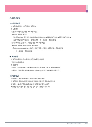 Sejong Cyber University 63%ucc28. %uc99d%uba85%uc11c%ubc1c%uae09 %u2299 %uc778%ud130%ub137%ubc1c%uae091) %ubc1c%uae09%uac00%ub2a5 %uc99d%uba85%uc11c : %ubaa8%ub4e0 %uc99d%uba85%uc11c %ubc1c%uae09%uac00%ub2a52) %uc2e0%uccad%uc808%ucc28 %u2460 %ubcf8%uad50%uc2dc%uc2a4%ud15c %uc774%uc6a9(%uc778%uc1c4 %ubc0f PDF %uc800%uc7a5 %uac00%ub2a5) %u2022 %uc7ac%ud559%uc0dd, %ud734%ud559%uc0dd, %uc878%uc5c5%uc0dd [%ub85c%uadf8%uc778] %u2192 [New %uc628%ub77c%uc778 %uac15%uc758%uc2e4(%ub300%ud559)] %u2192 [%ud559%uc0dd%uc11c%ube44%uc2a4] %u2192 [%uc99d%uba85%uc11c%ubc1c%uae09%uc2e0%uccad] %u2192 [%uc628%ub77c%uc778%ubc1c%uae09%uc2e0%uccad] %u2192 [%uc99d%uba85%uc11c%ubc1c%uae09 %ubc14%ub85c%uac00%uae30] %ud074%ub9ad %u2192 %uc99d%uba85%uc11c %uc120%ud0dd %u2192 %uc218%uc218%ub8cc %uacb0%uc81c %u2192 %uc99d%uba85%uc11c %ubc1c%uae09 %u2461 %uc11c%ud2b8%ud53c%uc544(Certpia)%uc11c%ube44%uc2a4 %uc774%uc6a9(%uc778%uc1c4 %ubc0f PDF %uc800%uc7a5 %uac00%ub2a5) %u2022 %uc7ac%ud559%uc0dd, %ud734%ud559%uc0dd, %uc878%uc5c5%uc0dd, %uc81c%uc801%uc0dd, %uc2dc%uac04%uc81c%ud559%uc0dd %u2022 [cybersejong.certpia.com %uc811%uc18d] %u2192 [%ud68c%uc6d0%uac00%uc785] %u2192 [%uc99d%uba85%uc11c %ubc1c%uae09] %uc120%ud0dd %u2192 %uc99d%uba85%uc11c %uc120%ud0dd %u2192 %uc218%uc218%ub8cc %uacb0%uc81c %u2192 %uc99d%uba85%uc11c %ubc1c%uae09%u2299 %ud329%uc2a4%ubc1c%uae09 1) %ubc1c%uae09%uac00%ub2a5 %uc99d%uba85%uc11c : %uc8fc%uc694 %uc99d%uba85%uc11c %ubc1c%uae09%uac00%ub2a5(%uc878%uc5c5, %uc131%uc801 %ub4f1) * %uc815%ubd8024 %uc0ac%uc774%ud2b8 %ucc38%uc870 2) %uc2e0%uccad%uc808%ucc28 %u2460 %ubc29%ubb38 : %uac00%uae4c%uc6b4 %uc8fc%ubbfc%uc13c%ud130 %ubc29%ubb38 %u2192 %ud329%uc2a4%ubbfc%uc6d0 %uc2e0%uccad %u2192 %uc218%uc218%ub8cc %ub0a9%ubd80 %u2192 %uc7ac%ubc29%ubb38%ud558%uc5ec %uc218%ub839 %u2461 %uc628%ub77c%uc778 : %uc815%ubd80%ubbfc%uc6d0%ud3ec%ud138 %ubbfc%uc6d024(www.minwon.go.kr)%uc5d0 %uc811%uc18d%ud558%uc5ec %ud329%uc2a4%ubbfc%uc6d0 %uc2e0%uccad %u2299 %ubc29%ubb38%ubc1c%uae09 1) %ubc1c%uae09%uc7a5%uc18c : %uc138%uc885%uc0ac%uc774%ubc84%ub300%ud559%uad50 %ubb34%ubc29%uad00 109%ud638 %ud559%uc0dd%uc9c0%uc6d0%ucc98 2) %ubc1c%uae09%uc808%ucc28 : %uc99d%uba85%uc11c %ubc1c%uae09 %ub2f4%ub2f9%uc790%uc5d0%uac8c %uc2e0%uccad%uc790 %ubcf8%uc778 %ud655%uc778 %ubc0f %uc99d%uba85%uc11c %ubc1c%uae09 %uc2e0%uccad 3) %ubc1c%uae09%uc218%uc218%ub8cc : %uad6d%ubb38%uc99d%uba85%uc11c(1%ud1b5) 500%uc6d0, %uc601%ubb38%uc99d%uba85%uc11c(1%ud1b5) 1,000%uc6d0 * %uc7a5%uc560%uc778 %ud559%uc6b0%uc758 %uacbd%uc6b0 %ubcf8%uad50 %ub0b4%ubc29 %ub610%ub294 %uc804%ud654 %ubb38%uc758 %uc2dc %ubc1c%uae09 %uc218%uc218%ub8cc %ubb34%ub8cc