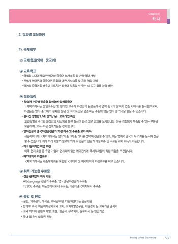 Sejong Cyber University 65Chapter%u2161%ud559 %uc0ac2. %ud559%uacfc%ubcc4 %uad50%uc721%uacfc%uc815%uac00. %uad6d%uc81c%ud559%ubd80 %u25ce %uad6d%uc81c%ud559%uacfc(%uc601%uc5b4 %u302e %uc911%uad6d%uc5b4) %u2299 %uad50%uc721%ubaa9%ud45c %u2022 %uad6d%uc81c%ud654 %uc2dc%ub300%uc5d0 %ud544%uc694%ud55c %uc601%uc5b4%uc640 %uc911%uad6d%uc5b4 %uc758%uc0ac%uc18c%ud1b5 %ubc0f %ubc88%uc5ed %uc5ed%ub7c9 %uac1c%ubc1c %u2022 %uc804%uc138%uacc4 %uc601%uc5b4%uad8c%uacfc %uc911%uad6d%uc5b4%uad8c %ubb38%ud654%uc5d0 %ub300%ud55c %uc9c0%uc2dd%uc2b5%ub4dd %ubc0f %uacf5%uc720 %uc5ed%ub7c9 %uac1c%ubc1c %u2022 %uc601%uc5b4%uc640 %uc911%uad6d%uc5b4%ub97c %ubc30%uc6b0%uace0 %uac00%ub974%uce58%ub294 %uc0c1%ud669%uc5d0 %uc801%uc6a9%ud560 %uc218 %uc788%ub294 AI %ub3c4%uad6c %ud65c%uc6a9 %ub2a5%ub825 %ubc30%uc591 %u2299 %ud559%uacfc%ud2b9%uc9d5 %u2022 %ud559%uc2b5%uc790 %uc218%uc900%ubcc4 %ub9de%ucda4%ud615 %ud654%uc0c1%uc601%uc5b4%u00b7%ud654%uc0c1%uc911%uad6d%uc5b4 %uad6d%uc81c%ud559%uacfc%uc5d0%uc11c%ub294 %uc804%uc784%uad50%uc218%uc9c4 %ubc0f %uc6d0%uc5b4%ubbfc %uad50%uc218%uac00 %ud654%uc0c1%uac15%uc758 %ud50c%ub7ab%ud3fc%uc5d0%uc11c %uc601%uc5b4%u00b7%uc911%uad6d%uc5b4 %ub9d0%ud558%uae30 %uc5f0%uc2b5 %uc11c%ube44%uc2a4%ub97c %uc2e4%uc2dc%ud568%uc73c%ub85c%uc368, %ud559%uc0dd%ub4e4%uc740 %uc601%uc5b4%u00b7%uc911%uad6d%uc5b4%uc758 %uc815%ud655%ud55c %ubc1c%uc74c %ubc0f %ud504%ub9ac%ud1a0%ud0b9%uc744 %uc5f0%uc2b5%ud558%ub294 %uc218%uc900%uc5d0 %ub9de%ub294 %uc5b8%uc5b4 %ud074%ub9ac%ub2c9%uc744 %ubc1b%uc744 %uc218 %uc788%uc2b5%ub2c8%ub2e4. %u2022 %uc2e4%uc2dc%uac04 %uc30d%ubc29%ud5a5 LIVE %uac15%uc758 / %uc628%u318d%uc624%ud504%ub77c%uc778 %ud2b9%uac15 %uad50%uacfc%ubaa9%ubcc4%ub85c %uc8fc 1%ud68c %ud654%uc0c1%uac15%uc758 %uc2dc%uc2a4%ud15c%uc744 %ud1b5%ud55c %uc2e4%uc2dc%uac04 %ud654%uc0c1 %ub300%uba74 %uac15%uc758%ub97c %uc2e4%uc2dc%ud569%ub2c8%ub2e4. %uc815%uaddc %uac15%uc88c%uc5d0%uc11c %ubd80%uc871%ud560 %uc218 %uc788%ub294 %ubd80%ubd84%uc744 %ubcf4%uc644%ud558%uba70, %uad50%uc218-%ud559%uc0dd %uc0c1%ud638%uc791%uc6a9%uc744 %uac15%ud654%ud569%ub2c8%ub2e4. %u2022 %uc601%uc5b4%uc804%uacf5%uacfc %uc911%uad6d%uc5b4%uc804%uacf5%uc804%ubb38%uac00 %uacfc%uc815 %uc774%uc218 %ubc0f %uc218%ub8cc%uc99d %uad50%ucc28 %ucde8%ub4dd %uc138%uc885%uc0ac%uc774%ubc84%ub300 %uad6d%uc81c%ud559%uacfc%uc5d0%uc11c%ub294 %uc601%uc5b4%uc640 %uc911%uad6d%uc5b4 %uc911 %ud558%ub098%ub97c %uc120%ud0dd%ud574 %uc804%uacf5%ud560 %uc218 %uc788%uace0, %ub610%ub294 %uc601%uc5b4%uc640 %uc911%uad6d%uc5b4 %ub450 %uac00%uc9c0%ub97c %ub3d9%uc2dc%uc5d0 %uc804%uacf5%ud560 %uc218 %uc788%uc2b5%ub2c8%ub2e4. %uc774%uc5d0 %ub530%ub77c %ud559%uc0dd%uc758 %ud544%uc694%uc5d0 %uc758%ud574 %ub450 %uc804%uacf5%uc758 %uc804%ubb38%uac00 %uacfc%uc815 %uc774%uc218 %ubc0f %uc218%ub8cc%uc99d %uad50%ucc28 %ucde8%ub4dd%uc774 %uac00%ub2a5%ud569%ub2c8%ub2e4. %u2022 %ubbf8%uad6d %ud604%uc9c0%uae30%uc5c5 %ucde8%uc5c5 %ucd94%ucc9c %ubbf8%uad6d %ud604%uc9c0 %ud638%ud154 %ub4f1 %uc720%uba85 %uae30%uc5c5%uacfc %uc5f0%uacc4%ub418%uc5b4 %uc788%ub294 %uc5d0%uc774%uc804%uc2dc%uc5d0 %uad6d%uc81c%ud559%uacfc%uc7a5%uc774 %uc9c1%uc811 %ucde8%uc5c5%uc744 %ucd94%ucc9c%ud569%ub2c8%ub2e4. %u2022 %ud574%uc678%ub300%ud559%uacfc %ud559%uc810%uad50%ub958 %uad6d%uc81c%ud559%uacfc%uc5d0%uc11c%ub294 %uc138%uc885%ub300%ud559%uad50%ub97c %ud3ec%ud568%ud55c %uad6d%ub0b4%ub300%ud559 %ubc0f %ud574%uc678%ub300%ud559%uacfc %ud559%uc810%uad50%ub958%ub97c %ud558%uace0 %uc788%uc2b5%ub2c8%ub2e4. %u2299 %ucde8%ub4dd %uac00%ub2a5%ud55c %uc218%ub8cc%uc99d %u2022 %uc804%uacf5 %uad00%uacc4%uc5c6%uc774 %ucde8%ub4dd %uac00%ub2a5 AI&Language %uc804%ubb38%uac00 %uc218%ub8cc%uc99d, %uc601%u318d%uc911%ubb38%ud654%uc804%ubb38%uac00 %uc218%ub8cc%uc99d TESOL %uc218%ub8cc%uc99d, %uc544%ub3d9%uc601%uc5b4%uc9c0%ub3c4%uc0ac %uc218%ub8cc%uc99d, %uc5b4%ub9b0%uc774%uc911%uad6d%uc5b4%uc9c0%ub3c4%uc0ac %uc218%ub8cc%uc99d%u2299 %uc878%uc5c5 %ud6c4 %uc9c4%ub85c %u2022 %uacf5%ud56d, %uc678%uad50%uc13c%ud130, %ub300%uc0ac%uad00, %uad50%uc721%uacf5%ubb34%uc6d0, %ub2e4%ubb38%ud654%uc13c%ud130 %ub4f1 %uacf5%uacf5%uae30%uad00 %u2022 %ubc29%uacfc%ud6c4 %uad50%uc0ac, %uc5b4%ub9b0%uc774%ud2b9%uc131%ud654%uad50%uc721 %uad50%uc0ac, %uad50%uc7ac%uac1c%ubc1c%uc5f0%uad6c%uc6d0, %ud559%uc6d0%uac15%uc0ac %ub4f1 %uad50%uc721%uae30%uad00 %uc885%uc0ac%uc790 %u2022 %uad50%uc721 %ubbf8%ub514%uc5b4 %ucf58%ud150%uce20 %uac1c%ubc1c, %ud638%ud154, %ud56d%uacf5%uc0ac, %ubb34%uc5ed%ud68c%uc0ac, %ubb3c%ub958%ud68c%uc0ac %ub4f1 %ubbfc%uac04%uae30%uc5c5 %u2022 %uad6d%ub0b4%u00b7%uc678 %uc720%uc218 %ub300%ud559%uc6d0 %uc9c4%ud559