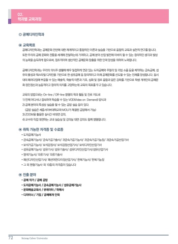 72 Sejong Cyber University02.%ud559%uacfc%ubcc4 %uad50%uc721%uacfc%uc815 %u25ce %uacf5%uc608%ub514%uc790%uc778%ud559%uacfc %u2299 %uad50%uc721%ubaa9%ud45c %uacf5%uc608%ub514%uc790%uc778%ud559%uacfc%ub294 %uacf5%uc608%ubb38%ud654 %uc804%ubc18%uc5d0 %ub300%ud55c %uccb4%uacc4%uc801%uc774%uace0 %ud1b5%ud569%uc801%uc778 %uc774%ub860%uacfc %uc2e4%uc2b5%uc744 %uae30%ubc18%uc73c%ub85c %uc735%ud569%uc801 %uad50%uc721%uacfc %uc2e4%ucc9c%uc801 %uc5f0%uad6c%ub97c %ud569%ub2c8%ub2e4. %ub610%ud55c %uc6b0%ub9ac%uc758 %uacf5%uc608 %ubb38%ud654%uc640 %uc804%ud1b5%uc744 %uc138%uacc4%uc5d0 %uc804%ub2ec%ud558%ub294%ub370 %uae30%uc5ec%ud558%uace0, %uacf5%uc608 %ubd84%uc57c %uc0b0%uc5c5 %ubc1c%uc804%uc5d0 %uc774%ubc14%uc9c0 %ud560 %uc218 %uc788%ub294 %ucc3d%uc758%uc801%uc778 %uc0dd%uac01%uacfc %ubc1c%uc0c1%uc758 %ub2a5%ub825%uc744 %uc2b5%ub4dd%ud558%uac8c %ud568%uc73c%ub85c%uc368, %ucc3d%uc870%uc801%uc774%uba70 %uc0dd%uc0b0%uc801%uc778 %uacf5%uc608%ubb38%ud654 %ucc3d%ucd9c%uc744 %uc704%ud55c %uc778%ub825 %uc591%uc131%uc744 %uc704%ud558%uc5ec %ub178%ub825%ud569%ub2c8%ub2e4. %uacf5%uc608%ub514%uc790%uc778%ud559%uacfc%ub294 %uc6b0%ub9ac%uc758 %uc758%uc2dd%uc8fc %uc0dd%ud65c%uc5d0 %ub9e4%uc6b0 %ubc00%uc811%ud558%uac8c %uc5f0%uad00 %uc788%ub294 %ub3c4%uc790%uacf5%uc608%uc640 %uc8fc%uc5bc%ub9ac %ubc0f %ub9ac%ube59 %uc18c%ud488 %ub4f1%uc744 %uc81c%uc791%ud558%ub294 %uae08%uc18d%uacf5%uc608, %uc12c%uc720%uc758 %ubb3c%uc131%uacfc %ud14d%uc2a4%ud0c0%uc77c %ub514%uc790%uc778%uc744 %uae30%ubc18%uc73c%ub85c %ud55c %uc12c%uc720%uacf5%uc608 %ub4f1 %ucc3d%uc758%uc801%uc774%uace0 %ubbf8%ub798 %uacf5%uc608%ubb38%ud654%ub97c %uc120%ub3c4%ud560 %uc218 %uc788%ub294 %uc778%uc7ac%ub97c %uc591%uc131%ud569%ub2c8%ub2e4. %ub3d9%uc2dc%ub300%uc758 %ud328%ub7ec%ub2e4%uc784%uc5d0 %ubd80%uc751%ud560 %uc218 %uc788%ub294 %uc608%uc220%uc801, %ud559%uc220%uc801 %uc774%ub860%uacfc %uae30%ucd08, %uc2ec%ud654 %ubc0f %uc7a5%ub974 %uc735%ud569%uacfc %uac19%uc740 %uac15%uc88c%ub97c %uae30%ubc18%uc73c%ub85c %ud559%uc0dd %uac1c%uac1c%uc778%uc758 %uacf5%uc608%ubb38%ud654 %uc7a5%uc778%uc815%uc2e0%uacfc %ub2a5%ub3d9%uc801%uc774%uace0 %ucc3d%uc758%uc801 %uc758%uc9c0%ub97c %uace0%uc591%ud558%ub294%ub370 %uad50%uc721%uc758 %ubaa9%ud45c%ub97c %ub450%uace0 %uc788%uc2b5%ub2c8%ub2e4. %uad50%uc721%uc758 %ubc29%ubc95%uc73c%ub85c%ub294 On-line / Off-line %ubcd1%ud589%uc758 %ud559%uacfc %ud65c%ub3d9 %ubc0f %uc9c4%ub85c %uc9c0%ub3c4%ub85c 1) %uc5b8%uc81c %uc5b4%ub514%uc11c%ub098 %uc811%uc18d%ud558%uc5ec %ud559%uc2b5%ud560 %uc218 %uc788%ub294 VOD(Video on Demand) %ubc29%uc2dd%uacfc 2) %uacf5%uc608 %ubd84%uc57c%uc758 %ud2b9%uc131%uc0c1 %uc2e4%uc2b5%uc744 %ud560 %uc218 %uc788%ub294 %uacf5%ubc29 %uc2e4%uc2b5 %ub4f1%uc774 %uc788%ub2e4. (%uacf5%ubc29 %uc2e4%uc2b5%uc740 %uc138%uc885%uc0ac%uc774%ubc84%ub300%ud559%uad50%uc640 MOU%uac00 %uccb4%uacb0%ub41c %uacf5%ubc29%uc5d0%uc11c %uac00%ub2a5) 3) ZOOM%uc744 %ud65c%uc6a9%ud55c %uc2e4%uc2dc%uac04 %ube44%ub300%uba74 %uac15%uc758, 4) %uad50%uc218%uc640 %uc9c1%uc811 %ub300%uba74%ud558%ub294 %uad50%ub0b4 %uc2e4%uc2b5%uc2e4 %ubc0f %uac15%uc758%uc2e4 %ub300%uba74 %uac15%uc758%ub3c4 %ud568%uaed8 %ubcd1%ud589%ud569%ub2c8%ub2e4. %u2299 %ucde8%ub4dd %uac00%ub2a5%ud55c %uc790%uaca9%uc99d %ubc0f %uc218%ub8cc%uc99d %u2022 %ub3c4%uc790%uacf5%uc608%uae30%ub2a5%uc0ac %u2022 %uae08%uc18d%uacf5%uc608%uae30%ub2a5%uc0ac/ %uae08%uc18d%uac00%uacf5%uae30%uc220%uc0ac/ %uadc0%uae08%uc18d%uac00%uacf5%uae30%ub2a5%uc0ac/ %uadc0%uae08%uc18d%uac00%uacf5%uae30%ub2a5%uc7a5/ %uadc0%uae08%uc18d%uac00%uacf5%uc0b0%uc5c5%uae30%uc0ac %u2022 %ubcf4%uc11d%uac00%uacf5%uae30%ub2a5%uc0ac/ %ubcf4%uc11d%uac10%uc815%uc0ac/ %ubcf4%uc11d%uac10%uc815%uc0b0%uc5c5%uae30%uc0ac/ %ubcf4%uc11d%ub514%uc790%uc778%uc0b0%uc5c5%uae30%uc0ac %u2022 %uc12c%uc720%uacf5%uc608%uae30%ub2a5%uc0ac/ %uc12c%uc720%uae30%uc0ac/ %uc12c%uc720%uae30%uc220%uc0ac/ %uc12c%uc720%ub514%uc790%uc778%uc0b0%uc5c5%uae30%uc0ac/%uc12c%uc720%uc0b0%uc5c5%uae30%uc0ac %u2022 %uc5fc%uc0c9%uae30%ub2a5%uc0ac/ %uc758%ub958%uae30%uc0ac/ %uc758%ub958%uae30%uc220%uc0ac %u2022 %ud328%uc120%ub514%uc790%uc778%uc0b0%uc5c5%uae30%uc0ac/ %ud328%uc158%uba38%ucc9c%ub2e4%uc774%uc9d5%uc0b0%uc5c5%uae30%uc0ac/ %ud55c%ubcf5%uae30%ub2a5%uc0ac/ %ud55c%ubcf5%uae30%ub2a5%uc7a5 %u2022 %uadf8 %uc678 %uc6d0%ud615%uae30%ub2a5%uc0ac %uc678 10%uc885%uc758 %uc790%uaca9%uc99d%uc774 %uc788%uc2b5%ub2c8%ub2e4 %u2299 %uc9c4%ucd9c %ubd84%uc57c %u2022 %uacf5%uc608 %uc791%uac00 / %uacf5%uc608 %uacf5%ubc29 %u2022 %ub3c4%uc790%uacf5%uc608%uae30%ub2a5%uc0ac / %uae08%uc18d%uacf5%uc608%uae30%ub2a5%uc0ac / %uc12c%uc720%uacf5%uc608%uae30%ub2a5%uc0ac %u2022 %ubb38%ud654%uc608%uc220%uad50%uc721%uc0ac / %ud050%ub808%uc774%ud130 / %ud559%uc608%uc0ac %u2022 %ub514%uc790%uc774%ub108 / %uae30%uc5c5 / %uacf5%uc608%ub9e4%uac1c %uc778%ub825