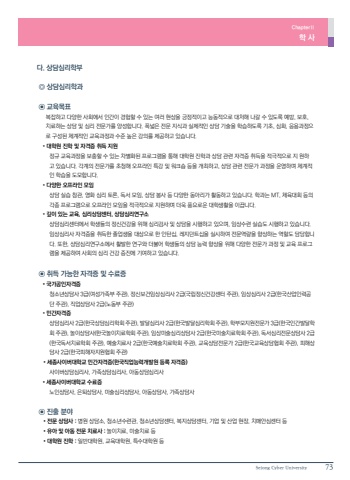 Sejong Cyber University 73Chapter%u2161%ud559 %uc0ac%ub2e4. %uc0c1%ub2f4%uc2ec%ub9ac%ud559%ubd80%u25ce %uc0c1%ub2f4%uc2ec%ub9ac%ud559%uacfc%u2299 %uad50%uc721%ubaa9%ud45c %ubcf5%uc7a1%ud558%uace0 %ub2e4%uc591%ud55c %uc0ac%ud68c%uc5d0%uc11c %uc778%uac04%uc774 %uacbd%ud5d8%ud560 %uc218 %uc788%ub294 %uc5ec%ub7ec %ud604%uc0c1%uc744 %uae0d%uc815%uc801%uc774%uace0 %ub2a5%ub3d9%uc801%uc73c%ub85c %ub300%ucc98%ud574 %ub098%uac08 %uc218 %uc788%ub3c4%ub85d %uc608%ubc29, %ubcf4%ud638, %uce58%ub8cc%ud558%ub294 %uc0c1%ub2f4 %ubc0f %uc2ec%ub9ac %uc804%ubb38%uac00%ub97c %uc591%uc131%ud569%ub2c8%ub2e4. %ud3ed%ub113%uc740 %uc804%ubb38 %uc9c0%uc2dd%uacfc %uc2e4%uc81c%uc801%uc778 %uc0c1%ub2f4 %uae30%uc220%uc744 %ud559%uc2b5%ud558%ub3c4%ub85d %uae30%ucd08, %uc2ec%ud654, %uc751%uc6a9%uacfc%uc815%uc73c%ub85c %uad6c%uc131%ub41c %uccb4%uacc4%uc801%uc778 %uad50%uc721%uacfc%uc815%uacfc %uc218%uc900 %ub192%uc740 %uac15%uc758%ub97c %uc81c%uacf5%ud558%uace0 %uc788%uc2b5%ub2c8%ub2e4. %u2022 %ub300%ud559%uc6d0 %uc9c4%ud559 %ubc0f %uc790%uaca9%uc99d %ucde8%ub4dd %uc9c0%uc6d0 %uc815%uaddc %uad50%uc721%uacfc%uc815%uc744 %ubcf4%ucda9%ud560 %uc218 %uc788%ub294 %ucc28%ubcc4%ud654%ub41c %ud504%ub85c%uadf8%ub7a8%uc744 %ud1b5%ud574 %ub300%ud559%uc6d0 %uc9c4%ud559%uacfc %uc0c1%ub2f4 %uad00%ub828 %uc790%uaca9%uc99d %ucde8%ub4dd%uc744 %uc801%uadf9%uc801%uc73c%ub85c %uc9c0 %uc6d0%ud558%uace0 %uc788%uc2b5%ub2c8%ub2e4. %uac01%uacc4%uc758 %uc804%ubb38%uac00%ub97c %ucd08%uccad%ud574 %uc624%ud504%ub77c%uc778 %ud2b9%uac15 %ubc0f %uc6cc%ud06c%uc20d %ub4f1%uc744 %uac1c%ucd5c%ud558%uace0, %uc0c1%ub2f4 %uad00%ub828 %uc804%ubb38%uac00 %uacfc%uc815%uc744 %uc6b4%uc601%ud558%uba70 %uccb4%uacc4%uc801%uc778 %ud559%uc2b5%uc744 %ub3c4%ubaa8%ud569%ub2c8%ub2e4. %u2022 %ub2e4%uc591%ud55c %uc624%ud504%ub77c%uc778 %ubaa8%uc784 %uc0c1%ub2f4 %uc2e4%uc2b5 %ucc38%uad00, %uc601%ud654 %uc2ec%ub9ac %ud1a0%ub860, %ub3c5%uc11c %ubaa8%uc784, %uc0c1%ub2f4 %ubd09%uc0ac %ub4f1 %ub2e4%uc591%ud55c %ub3d9%uc544%ub9ac%uac00 %ud65c%ub3d9%ud558%uace0 %uc788%uc2b5%ub2c8%ub2e4. %ud559%uacfc%ub294 MT, %uccb4%uc721%ub300%ud68c %ub4f1%uc758 %uac01%uc885 %ud504%ub85c%uadf8%ub7a8%uc73c%ub85c %uc624%ud504%ub77c%uc778 %ubaa8%uc784%uc744 %uc801%uadf9%uc801%uc73c%ub85c %uc9c0%uc6d0%ud558%uba70 %ub354%uc6b1 %ud48d%uc694%ub85c%uc6b4 %ub300%ud559%uc0dd%ud65c%uc744 %uc774%ub055%ub2c8%ub2e4. %u2022 %uae4a%uc774 %uc788%ub294 %uad50%uc721, %uc2ec%ub9ac%uc0c1%ub2f4%uc13c%ud130, %uc0c1%ub2f4%uc2ec%ub9ac%uc5f0%uad6c%uc18c %uc0c1%ub2f4%uc2ec%ub9ac%uc13c%ud130%uc5d0%uc11c %ud559%uc0dd%ub4e4%uc758 %uc815%uc2e0%uac74%uac15%uc744 %uc704%ud574 %uc2ec%ub9ac%uac80%uc0ac %ubc0f %uc0c1%ub2f4%uc744 %uc2dc%ud589%ud558%uace0 %uc788%uc73c%uba70, %uc784%uc0c1%uc218%ub828 %uc2e4%uc2b5%ub3c4 %uc2dc%ud589%ud558%uace0 %uc788%uc2b5%ub2c8%ub2e4. %uc784%uc0c1%uc2ec%ub9ac%uc0ac %uc790%uaca9%uc99d%uc744 %ucde8%ub4dd%ud55c %uc878%uc5c5%uc0dd%uc744 %ub300%uc0c1%uc73c%ub85c %ud55c %uc778%ud134%uc2ed, %ub808%uc9c0%ub358%ud2b8%uc2ed%uc744 %uc2e4%uc2dc%ud558%uc5ec %uc804%ubb38%uc5ed%ub7c9%uc744 %ud5a5%uc0c1%ud558%ub294 %uc5ed%ud560%ub3c4 %ub2f4%ub2f9%ud569%ub2c8%ub2e4. %ub610%ud55c, %uc0c1%ub2f4%uc2ec%ub9ac%uc5f0%uad6c%uc18c%uc5d0%uc11c %ud65c%ubc1c%ud55c %uc5f0%uad6c%uc640 %ub354%ubd88%uc5b4 %ud559%uc0dd%ub4e4%uc758 %uc0c1%ub2f4 %ub2a5%ub825 %ud5a5%uc0c1%uc744 %uc704%ud574 %ub2e4%uc591%ud55c %uc804%ubb38%uac00 %uacfc%uc815 %ubc0f %uad50%uc721 %ud504%ub85c%uadf8%ub7a8%uc744 %uc81c%uacf5%ud558%uc5ec %uc0ac%ud68c%uc758 %uc2ec%ub9ac %uac74%uac15 %uc99d%uc9c4%uc5d0 %uae30%uc5ec%ud558%uace0 %uc788%uc2b5%ub2c8%ub2e4. %u2299 %ucde8%ub4dd %uac00%ub2a5%ud55c %uc790%uaca9%uc99d %ubc0f %uc218%ub8cc%uc99d %u2022 %uad6d%uac00%uacf5%uc778%uc790%uaca9%uc99d %uccad%uc18c%ub144%uc0c1%ub2f4%uc0ac 3%uae09(%uc5ec%uc131%uac00%uc871%ubd80 %uc8fc%uad00), %uc815%uc2e0%ubcf4%uac74%uc784%uc0c1%uc2ec%ub9ac%uc0ac 2%uae09(%uad6d%ub9bd%uc815%uc2e0%uac74%uac15%uc13c%ud130 %uc8fc%uad00), %uc784%uc0c1%uc2ec%ub9ac%uc0ac 2%uae09(%ud55c%uad6d%uc0b0%uc5c5%uc778%ub825%uacf5%ub2e8 %uc8fc%uad00), %uc9c1%uc5c5%uc0c1%ub2f4%uc0ac 2%uae09(%ub178%ub3d9%ubd80 %uc8fc%uad00) %u2022 %ubbfc%uac04%uc790%uaca9%uc99d %uc0c1%ub2f4%uc2ec%ub9ac%uc0ac 2%uae09(%ud55c%uad6d%uc0c1%ub2f4%uc2ec%ub9ac%ud559%ud68c %uc8fc%uad00), %ubc1c%ub2ec%uc2ec%ub9ac%uc0ac 2%uae09(%ud55c%uad6d%ubc1c%ub2ec%uc2ec%ub9ac%ud559%ud68c %uc8fc%uad00), %ud559%ubd80%ubaa8%uc9c0%uc6d0%uc804%ubb38%uac00 3%uae09(%ud55c%uad6d%uc778%uac04%ubc1c%ub2ec%ud559%ud68c %uc8fc%uad00), %ub180%uc774%uc0c1%ub2f4%uc0ac(%ud55c%uad6d%ub180%uc774%uce58%ub8cc%ud559%ud68c %uc8fc%uad00), %uc784%uc0c1%ubbf8%uc220%uc2ec%ub9ac%uc0c1%ub2f4%uc0ac 2%uae09(%ud55c%uad6d%ubbf8%uc220%uce58%ub8cc%ud559%ud68c %uc8fc%uad00), %ub3c5%uc11c%uc2ec%ub9ac%uc804%ubb38%uc0c1%ub2f4%uc0ac 2%uae09(%ud55c%uad6d%ub3c5%uc11c%uce58%ub8cc%ud559%ud68c %uc8fc%uad00), %uc608%uc220%uce58%ub8cc%uc0ac 2%uae09(%ud55c%uad6d%uc608%uc220%uce58%ub8cc%ud559%ud68c %uc8fc%uad00), %uad50%uc721%uc0c1%ub2f4%uc804%ubb38%uac00 2%uae09(%ud55c%uad6d%uad50%uc721%uc0c1%ub2f4%ud611%ud68c %uc8fc%uad00), %ud53c%ud574%uc0c1%ub2f4%uc0ac 2%uae09(%ud55c%uad6d%ud53c%ud574%uc790%uc9c0%uc6d0%ud611%ud68c %uc8fc%uad00) %u2022 %uc138%uc885%uc0ac%uc774%ubc84%ub300%ud559%uad50 %ubbfc%uac04%uc790%uaca9%uc99d(%ud55c%uad6d%uc9c1%uc5c5%ub2a5%ub825%uac1c%ubc1c%uc6d0 %ub4f1%ub85d %uc790%uaca9%uc99d) %uc0ac%uc774%ubc84%uc0c1%ub2f4%uc2ec%ub9ac%uc0ac, %uac00%uc871%uc0c1%ub2f4%uc2ec%ub9ac%uc0ac, %uc544%ub3d9%uc0c1%ub2f4%uc2ec%ub9ac%uc0ac %u2022 %uc138%uc885%uc0ac%uc774%ubc84%ub300%ud559%uad50 %uc218%ub8cc%uc99d %ub178%uc778%uc0c1%ub2f4%uc0ac, %uc740%ud1f4%uc0c1%ub2f4%uc0ac, %ubbf8%uc220%uc2ec%ub9ac%uc0c1%ub2f4%uc0ac, %uc544%ub3d9%uc0c1%ub2f4%uc0ac, %uac00%uc871%uc0c1%ub2f4%uc0ac %u2299 %uc9c4%ucd9c %ubd84%uc57c %u2022 %uc804%ubb38 %uc0c1%ub2f4%uc0ac : %ubcd1%uc6d0 %uc0c1%ub2f4%uc18c, %uccad%uc18c%ub144%uc218%ub828%uad00, %uccad%uc18c%ub144%uc0c1%ub2f4%uc13c%ud130, %ubcf5%uc9c0%uc0c1%ub2f4%uc13c%ud130, %uae30%uc5c5 %ubc0f %uc0b0%uc5c5 %ud604%uc7a5, %uce58%ub9e4%uc548%uc2ec%uc13c%ud130 %ub4f1 %u2022 %uc720%uc
