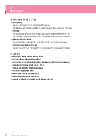 76 Sejong Cyber University02.%ud559%uacfc%ubcc4 %uad50%uc721%uacfc%uc815 %u2299 %ucde8%ub4dd %uac00%ub2a5%ud55c %uc790%uaca9%uc99d %ubc0f %uc218%ub8cc%uc99d %u2022 %uad6d%uac00%uacf5%uc778%uc790%uaca9%uc99d %ubcf4%uc721%uad50%uc0ac 2%uae09(%ubcf4%uac74%ubcf5%uc9c0%ubd80 %uc8fc%uad00), %uc7a5%uc560%uc601%uc720%uc544%ub97c%uc704%ud55c%ubcf4%uc721%uad50%uc0ac, %ubc1c%ub2ec%uc7ac%ud65c%uc11c%ube44%uc2a4%uc81c%uacf5%uc778%ub825(%ub180%uc774%uc2ec%ub9ac%uc7ac%ud65c%ubd84%uc57c), %uccad%uc18c%ub144%uc0c1%ub2f4%uc0ac3%uae09, %uccad%uc18c%ub144%uc9c0%ub3c4%uc0ac2%uae09, %uac74%uac15%uac00%uc815%uc0ac %u2022 %ubbfc%uac04%uc790%uaca9%uc99d %uc544%ub3d9%uc0c1%ub2f4%uc0ac 3%uae09(%ud55c%uad6d%uc544%ub3d9%ud559%ud68c %uc8fc%uad00), %ubbf8%uc220%uc2ec%ub9ac%uc0c1%ub2f4%uc0ac2%uae09(%ud55c%uad6d%uc815%uc2e0%ubcf4%uac74%ubbf8%uc220%uce58%ub8cc%ud559%ud68c %uc8fc%uad00), %uad50%uc721%uae30%uad00%uc804%ubb38%uc2ec%ub9ac%uc0c1%ub2f4%uc0ac(%ubaa8%ub4e0%ub9c8%uc74c%uc13c%ud130 %uc8fc%uad00), %ud559%uad50%ud3ed%ub825%uc608%ubc29%uc9c0%ub3c4%uc0ac, %ub450%ub1cc%ud559%uc2b5%ubcf4%ub4dc%uac8c%uc784%uc9c0%ub3c4%uc0ac %u2022 %uc138%uc885%uc0ac%uc774%ubc84%ub300%ud559%uad50 %ubbfc%uac04%uc790%uaca9%uc99d %uc720%uc544%ub180%uc774%uc0c1%ub2f4%uc804%ubb38%uac00, %ubd80%ubaa8%uad50%uc721%uc804%ubb38%uac00, %uc544%ub3d9%u00b7%uac00%uc871%uc0c1%ub2f4%uc804%ubb38%uac00, %uc790%uae30%uc8fc%ub3c4%ud559%uc2b5%ucf54%uce6d%uc9c0%ub3c4%uc0ac %u2022 %uc804%ubb38%uac00%uacfc%uc815 %uc218%ub8cc %ud6c4 %ucde8%ub4dd %uac00%ub2a5%ud55c %uc218%ub8cc%uc99d %ubd80%ubaa8%uc0c1%ub2f4%u00b7%uc544%ub3d9%uc9c0%uc6d0%uc804%ubb38%uac00, %uc628%uc885%uc77c%ub3cc%ubd04%uc804%ubb38%uac00, %uc544%ub3d9%uc601%uc5b4%uad50%uc721%uc804%ubb38%uac00, %ub2e4%ubb38%ud654%uc0ac%ud68c%uc804%ubb38%uac00 2%uae09%u2299 %uc9c4%ucd9c %ubd84%uc57c %u2022 %uc544%ub3d9%uacfc %uac00%uc871%uc758 %ub3cc%ubd04%uc744 %uc9c0%uc6d0%ud558%ub294 %ubcf4%uc721%uc2dc%uc124 %uc6b4%uc601%uc790 %u2022 %ubbf8%ub798%uc778%uc7ac%uc758 %ub3cc%ubd04%uacfc %uad50%uc721%uc744 %uc9c0%uc6d0%ud558%ub294 %ubcf4%uc721%uad50%uc0ac %u2022 %uc131%uc7a5%uae30 %ubc1c%ub2ec%uc9c0%uc5f0 %ubc0f %ubc1c%ub2ec%uc7a5%uc560%uc544%ub3d9%uc744 %uc9c0%uc6d0%ud558%ub294 %ubc1c%ub2ec%uc7ac%ud65c%uc11c%ube44%uc2a4%uc81c%uacf5%uc778%ub825(%ub180%uc774%uc2ec%ub9ac%uc7ac%ud65c%ubd84%uc57c) %u2022 %uc544%ub3d9%ubcf4%uc721%ubcf5%uc9c0%uad00%ub828 %uc815%ucc45%uacfc %ud589%uc815%uc744 %ub2f4%ub2f9%ud558%ub294 %uacf5%ubb34%uc6d0 %u2022 %uc544%uc774%ub4e4%uc758 %uc131%uc7a5%uc744 %ud568%uaed8%ud558%ub294 %ubc29%uacfc%ud6c4 %ucd08%ub4f1 %ub3cc%ubd04%uad50%uc0ac %u2022 %ubcf4%uc721, %uc720%uc544%uad50%uc721%uad00%ub828 %ucf58%ud150%uce20 %uac1c%ubc1c%uc790 %u2022 %uc544%ub3d9%uacfc %uac00%uc871%uc744 %ub300%uc0c1%uc73c%ub85c %ud558%ub294 %uc804%ubb38 %uc0c1%ub2f4%uac00 %u2022 %uc721%uc544%uc885%ud569%uc9c0%uc6d0%uc13c%ud130 %uc6b4%uc601%uc694%uc6d0, %ubcf4%uc721%uc804%ubb38%uc694%uc6d0 %u2022 %uc7a5%uc560%uc544%ub3d9 %ubc0f %uac00%uc871%uc5d0%uac8c %uc11c%ube44%uc2a4 %uc9c0%uc6d0%uacfc %uc815%ubcf4%ub97c %uc81c%uacf5%ud558%ub294 %uc804%ubb38 %uc778%ub825