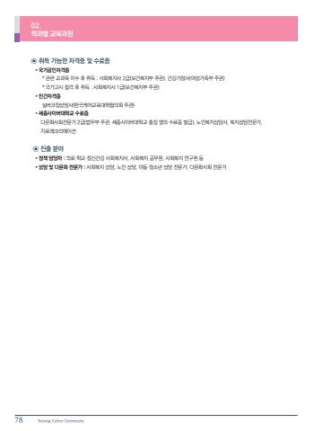 78 Sejong Cyber University02.%ud559%uacfc%ubcc4 %uad50%uc721%uacfc%uc815%u2299 %ucde8%ub4dd %uac00%ub2a5%ud55c %uc790%uaca9%uc99d %ubc0f %uc218%ub8cc%uc99d %u2022 %uad6d%uac00%uacf5%uc778%uc790%uaca9%uc99d * %uad00%ub828 %uad50%uacfc%ubaa9 %uc774%uc218 %ud6c4 %ucde8%ub4dd : %uc0ac%ud68c%ubcf5%uc9c0%uc0ac 2%uae09(%ubcf4%uac74%ubcf5%uc9c0%ubd80 %uc8fc%uad00), %uac74%uac15%uac00%uc815%uc0ac(%uc5ec%uc131%uac00%uc871%ubd80 %uc8fc%uad00) * %uad6d%uac00%uace0%uc2dc %ud569%uaca9 %ud6c4 %ucde8%ub4dd : %uc0ac%ud68c%ubcf5%uc9c0%uc0ac 1%uae09(%ubcf4%uac74%ubcf5%uc9c0%ubd80 %uc8fc%uad00) %u2022 %ubbfc%uac04%uc790%uaca9%uc99d %uc2e4%ubc84%ucf54%uce6d%uc0c1%ub2f4%uc0ac(%ud55c%uad6d%ucf00%uc5b4%uad50%uc721%ub300%ud559%ud611%uc758%ud68c %uc8fc%uad00) %u2022 %uc138%uc885%uc0ac%uc774%ubc84%ub300%ud559%uad50 %uc218%ub8cc%uc99d %ub2e4%ubb38%ud654%uc0ac%ud68c%uc804%ubb38%uac00 2%uae09(%ubc95%ubb34%ubd80 %uc8fc%uad00, %uc138%uc885%uc0ac%uc774%ubc84%ub300%ud559%uad50 %ucd1d%uc7a5 %uba85%uc758 %uc218%ub8cc%uc99d %ubc1c%uae09), %ub178%uc778%ubcf5%uc9c0%uc0c1%ub2f4%uc0ac, %ubcf5%uc9c0%uc0c1%ub2f4%uc804%ubb38%uac00, %uce58%ub8cc%ub808%ud06c%ub9ac%uc5d0%uc774%uc158 %u2299 %uc9c4%ucd9c %ubd84%uc57c %u2022 %uc815%ucc45 %ub2f4%ub2f9%uc790 : %uc758%ub8cc%u00b7%ud559%uad50%u00b7%uc815%uc2e0%uac74%uac15 %uc0ac%ud68c%ubcf5%uc9c0%uc0ac, %uc0ac%ud68c%ubcf5%uc9c0 %uacf5%ubb34%uc6d0, %uc0ac%ud68c%ubcf5%uc9c0 %uc5f0%uad6c%uc6d0 %ub4f1 %u2022 %uc0c1%ub2f4 %ubc0f %ub2e4%ubb38%ud654 %uc804%ubb38%uac00 : %uc0ac%ud68c%ubcf5%uc9c0 %uc0c1%ub2f4, %ub178%uc778 %uc0c1%ub2f4, %uc544%ub3d9%u00b7%uccad%uc18c%ub144 %uc0c1%ub2f4 %uc804%ubb38%uac00, %ub2e4%ubb38%ud654%uc0ac%ud68c %uc804%ubb38%uac00