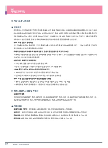 82 Sejong Cyber University02.%ud559%uacfc%ubcc4 %uad50%uc721%uacfc%uc815 %u25ce %uc138%ubb34%u2022%ud68c%uacc4%u2022%uae08%uc735%ud559%uacfc %u2299 %uad50%uc721%ubaa9%ud45c %uc6b0%ub9ac %ud559%uacfc%ub294 %uae30%uc5c5%uc815%ubcf4%uc758 %uacf5%uc778%uc804%ubb38%uac00 %uc591%uc131%uc744 %ubaa9%ud45c%ub85c %uc138%ubb34, %ud68c%uacc4, %uae08%uc735 %ubd84%uc57c%uc5d0%uc11c %uccb4%uacc4%ud654%ub41c %uad50%uc721%uacfc%uc815%uc744 %uc81c%uacf5%ud569%ub2c8%ub2e4. %ubcf8%uad50%uac00 %uc81c%uc2dc%ud558%ub294 %uacfc%uc815%uc744 %ucda9%uc2e4%ud788 %uc774%uc218%ud55c%ub2e4%uba74 %uae30%uc5c5%uc5d0%uc11c %ubc1c%uc0dd%ud558%ub294 %ud68c%uacc4%ucc98%ub9ac %ubb38%uc81c, %uc138%ubb34%uc758 %uc774%ub860%uacfc %uc2e4%ubb34 %ubb38%uc81c, %uae08%uc735%uc758 %ud22c%uc790 %ubb38%uc81c %ub4f1%uc744 %uc885%ud569%uc801%uc73c%ub85c %ud574%uacb0%ud560 %uc218 %uc788%ub294 %uc5ed%ub7c9%uacfc %uc790%uaca9%uc744 %uac16%ucd9c %uc218 %uc788%uc2b5%ub2c8%ub2e4. %ud68c%uacc4%ub97c %uae30%ubc18%uc73c%ub85c %uc138%ubb34, %uae08%uc735%uae4c%uc9c0 %uc774%uc5b4%uc9c0%ub294 %uc785%uccb4%uc801%uc778 %uad50%uc721%uacfc%uc815%uc744 %ud1b5%ud574 %uc7ac%ubb34%uc815%ubcf4%uc758 %uc0dd%uc0b0 %ubc0f %ud65c%uc6a9, %uc808%uc138 %ubc0f %ud22c%uc790%uc804%ub7b5%uc5d0%uc11c %uc735%ud569%uc801 %ub2a5%ub825%uc744 %uac16%ucd98 %uacf5%uc778 %uc804%ubb38%uac00%ub97c %uc591%uc131%ud569%ub2c8%ub2e4. %u2022 %uc138%ubb34, %ud68c%uacc4, %uae08%uc735%uc758 %ub3d9%uc2dc%ud559%uc2b5 %uae30%uc5c5%uc815%ubcf4%ub97c %uc0dd%uc0b0%ud558%ub294 %ud68c%uacc4%uc804%uacf5, %uae30%uc5c5%uc758 %ud68c%uacc4%uc815%ubcf4%ub97c %ubc14%ud0d5%uc73c%ub85c %uc138%uae08%uc744 %uacc4%uc0b0%ud558%ub294 %uc138%ubb34%uc804%uacf5, %uae30%uc5c5 %uc815%ubcf4%uc640 %uc138%uae08%uc744 %uace0%ub824%ud558%uc5ec %ud22c%uc790%uacb0%uc815%uc744 %ub0b4%ub9ac%ub294 %uae08%uc735%uc804%uacf5%uc744 %ub3d9%uc2dc%uc5d0 %ud559%uc2b5 %u2022 %uad6d%uc81c%uc801%uc778 %ud559%uc220%ub2a5%ub825%uacfc %uc138%ubb34%u00b7%ud68c%uacc4%uc2e4%ubb34 %uc804%ubb38%uac00, %uae08%uc735%uc758 %ud604%uc7a5%uc804%ubb38%uac00 %ub4f1 %ucd5c%uace0%uc758 %uad50%uc218%uc9c4 %uad6d%uc81c%uc801%uc778 %ud559%uc220%ub2a5%ub825%uc744 %uac16%ucd98 %uc804%uc784%uad50%uc6d0, %uc2e4%ubb34%ub2a5%ub825%uc744 %uacb8%ube44%ud55c %ud68c%uacc4%uc0ac %ubc0f %uc138%ubb34%uc0ac, %uc8fc%uc2dd %ub4f1 %uae08%uc735%uc5c5%uacc4%uc758 %ud604%uc7a5 %uc804%ubb38%uac00%ub85c %uad6c%uc131%ub41c %ucd5c%uace0%uc758 %uad50%uc218%uc9c4%uc774 %ud559%uc2b5%uc9c0%ub3c4%uc640 %uc9c4%ub85c%uc0c1%ub2f4%uc744 %ucc45%uc784 %u2022 %uc2e4%uc6a9%uc801%uc774%uace0 %uccb4%uacc4%uc801%uc778 %uad50%uacfc%ubaa9 %uad6c%uc131 - %ud68c%uacc4, %uc138%ubb34, %uae08%uc735 %ubd84%uc57c%uc758%uc774%ub860 %ubc0f %uc2e4%ubb34 %ud1b5%ud569 %uad50%uc721 - %ub09c%uc774%ub3c4 %ubc0f %uc5f0%uacc4%uc131%uc744 %uace0%ub824%ud55c %uae30%ucd08-%uc2ec%ud654-%uc751%uc6a9 %ub2e8%uacc4%uc758 %uad50%uc721%uacfc%uc815%uc744 %uc81c%uc2dc %u2022 100% %uc628%ub77c%uc778 %uc218%uc5c5 + %uba54%ud0c0%ubc84%uc2a4 %ub4f1 %uc2e4%uc2dc%uac04 %ub77c%uc774%ube0c %uac15%uc758 - 100% %uc628%ub77c%uc778 %uae30%ubc18%uc758 %ud559%uacfc %uc218%uc5c5%uc73c%ub85c %uc2dc%uacf5%uac04 %uc81c%uc57d%uc5c6%uc774 %ud559%uc2b5 %uac00%ub2a5 - %uc815%uaddc%uc218%uc5c5 %uc678 %uba54%ud0c0%ubc84%uc2a4 %ub4f1 %uc2e4%uc2dc%uac04 %ub77c%uc774%ube0c %ud2b9%uac15, %ud559%uacfc %ud589%uc0ac%ub85c %uc0c1%ud638%uc18c%ud1b5 %u2022 %uc138%ubb34, %ud68c%uacc4, %uae08%uc735 %uc804%ubb38%uc790%uaca9%uc99d %ucde8%ub4dd%uacfc %uc9c4%ub85c%ucee8%uc124%ud305 %uc2dc%uc2a4%ud15c - %uc138%ubb34%uc0ac, %uacf5%uc778%ud68c%uacc4%uc0ac, %uc7ac%uacbd%uad00%ub9ac%uc0ac %ub4f1 %uc790%uaca9%uc99d %ucde8%ub4dd%uc744 %uc704%ud55c %ud2b9%uac15 %ubc0f %uc2a4%ud130%ub514 %uadf8%ub8f9 %uc9c0%uc6d0 - %uc138%ubb34%uacf5%ubb34%uc6d0, %ud68c%uacc4%uc9c1 %uacf5%ubb34%uc6d0 %ub4f1%uc758 %uc2dc%ud5d8%uc900%ube44 %ubc0f %uac1c%uc778%ubcc4 %uc9c4%ub85c%ub97c %uc704%ud55c %ub9de%ucda4%ud615 %uc0c1%ub2f4 %u2299 %ucde8%ub4dd %uac00%ub2a5%ud55c %uc790%uaca9%uc99d %ubc0f %uc218%ub8cc%uc99d %u2022 %uad6d%uac00%uacf5%uc778%uc790%uaca9%uc99d %uc7ac%uacbd%uad00%ub9ac%uc0ac(%uc0bc%uc77c%ud68c%uacc4%ubc95%uc778 %uc8fc%uad00), %ud68c%uacc4%uad00%ub9ac 1%uae09, 2%uae09(%uc0bc%uc77c%ud68c%uacc4%ubc95%uc778 %uc8fc%uad00), FAT 1%uae09, 2%uae09(%ud55c%uad6d%uacf5%uc778%ud68c%uacc4%uc0ac%ud68c %uc8fc%uad00), TAT 1%uae09, 2%uae09(%ud55c%uad6d%uacf5%uc778%ud68c%uacc4%uc0ac%ud68c %uc8fc%uad00), %uc138%ubb34%uc0ac(%ud55c%uad6d%uc0b0%uc5c5%uc778%ub825%uacf5%ub2e8 %uc8fc%uad00), %uacf5%uc778%ud68c%uacc4%uc0ac(%uae08%uc735%uac10%ub3c5%uc6d0 %uc8fc%uad00) %u2299 %uc9c4%ucd9c %ubd84%uc57c %u2022 %ud68c%uacc4 %ubc0f %uc138%ubb34 %uc804%ubb38%uc9c1 : %uacf5%uc778%ud68c%uacc4%uc0ac, %uc138%ubb34%uc0ac %ub4f1 %uc815%ub144 %uc5c6%ub294 %uc804%ubb38%uc9c1%uc73c%ub85c %ud65c%ub3d9%ud560 %uc218 %uc788%uc2b5%ub2c8%ub2e4. %u2022 %uc77c%ubc18 %uae30%uc5c5 : %uc77c%ubc18 %uae30%uc5c5%uc758 %ud68c%uacc4, %uc7ac%ubb34 %ubd80%uc11c%uc5d0%uc11c %uc804%uc0b0%ud68c%uacc4 %ubc0f %uc138%ubb34 %uc2dc%uc2a4%ud15c%uc744 %uad00%ub9ac%ud558%ub294 %uc5c5%ubb34%ub97c %ub2f4%ub2f9%ud560 %uc218 %uc788%uc2b5%ub2c8%ub2e4 %u2022 %uae08%uc735%uae30%uad00 : %uc740%ud589, %uc99d%uad8c%uc0ac, %ud22c%uc790%uc6b4%uc6a9%uc0ac %ub4f1%uc5d0%uc11c %ud380%ub4dc%ub9e4%ub2c8%uc800, %uc7ac%ubb34%uc120%uacc4%uc0ac, %uc790%uc0b0%uad00%ub9ac%uc0ac %ub4f1%uc73c%ub85c %uc885%uc0ac%ud560 %uc218 %uc788%uc2b5%ub2c8%ub2e4. %u2022 %uacf5%uacf5%uae30%uad00 : %uc138%ubb34, %uad00%uc138, %ud589%uc815 %ubd84%uc57c %uacf5%ubb34%uc6d0%uc73c%ub85c %uc784%uc6a9%ub418%uc5b4 %uacf5%uacf5%uae30%uad00%uc5d0%uc11c %uc77c%ud560 %uc218 %uc788%uc2b5%ub2c8%ub2e4.
