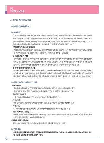 86 Sejong Cyber University02.%ud559%uacfc%ubcc4 %uad50%uc721%uacfc%uc815%uc0ac. %uc790%uc0b0%uad00%ub9ac%uac74%ucd95%uac74%uc124%ud559%ubd80 %u25ce %ubd80%ub3d9%uc0b0%uacbd%ub9e4%uc911%uac1c%ud559%uacfc %u2299 %uad50%uc721%ubaa9%ud45c %uad6d%ub0b4 %ucd5c%ucd08%ub85c %uac1c%uc124%ub41c %uacbd%ub9e4%uc911%uac1c%ud559%uacfc%ub85c, %ubd80%ub3d9%uc0b0 %ubd84%uc57c%uc758 %uae30%ucd08 %uc9c0%uc2dd%uc5d0%uc11c%ubd80%ud130 %ubd80%ub3d9%uc0b0%uc0ac%ubc95%uacfc %uacf5%ubc95, %ubd80%ub3d9%uc0b0%uc911%uac1c%u00b7%uacc4%uc57d %uc2e4%ubb34, %ubd80%ub3d9%uc0b0%uacbd%ub9e4, %uacbd%ub9e4%uc0ac%ub840%uc640 %uad8c%ub9ac%ubd84%uc11d, %ubbfc%uc0ac%uc9d1%ud589%ubc95%uc2e4%ubb34, %ucc44%uad8c%ubc95%uacfc %ubb3c%uad8c%ubc95, %ubd80%ub3d9%uc0b0%uad8c%ub9ac%ubd84%uc11d%uacfc %uacbd%uacf5%ub9e4%ud22c%uc790%uc2e4%ubb34, AI%ubd80%ub3d9%uc0b0%uacbd%ub9e4%ubb3c%uac74%ud22c%uc790%ubd84%uc11d %ub4f1 %ub2e4%uc591%ud55c %uad50%uacfc%uacfc%uc815%uc744 %ud1b5%ud574 %ubd80%ub3d9%uc0b0%uacbd%ub9e4%uc911%uac1c%uc804%ubb38%uac00%ub97c %uc591%uc131%ud558%uace0 %uc788%uc2b5%ub2c8%ub2e4. %ub610%ud55c %uc2e4%uc804%uacbd%ub9e4%uc5f0%uad6c%ud68c, %uacf5%uc778%uc911%uac1c%uc0ac %ucc3d%uc5c5%uacbd%uc601%uc2e4%ubb34 %uc804%ubb38%uac00%uacfc%uc815 %ub4f1 %uc218%uc694%uc5d0 %ub9de%ucd98 %ud2b9%ubcc4%ud504%ub85c%uadf8%ub7a8%uacfc %uc790%uaca9%uc99d %ub300%ube44%ubc18%uc744 %ud65c%ubc1c%ud558%uac8c %uc6b4%uc601%ud558%uace0 %uc788%uc2b5%ub2c8%ub2e4. %u2022 %ub9de%ucda4%ud615 %uc804%ubb38%uac00%ub97c %ud0a4%uc6b0%ub294 %uad50%uc721%uacfc%uc815 NCS(%uad6d%uac00%uc9c1%ubb34%ub2a5%ub825%ud45c%uc900) %uae30%ubc18 %ucd5c%uace0%uc758 %uad50%uc721%uacfc%uc815%uc744 %uc6b4%uc601%ud558%uace0 %uc788%uc2b5%ub2c8%ub2e4. %ucd08%ubcf4%uc790%ub294 %ubb3c%ub860 %uc804%ubb38%uac00%ub97c %uc704%ud55c %ub2e4%uc591%ud55c %uad50%uc721, %uc138%ubd84%ud654%ub41c %uc804%ubb38%uac00%uacfc%uc815%uc758 %uc774%uc218%ub97c %ud1b5%ud574 %ud559%uc0dd%ub4e4%uc740 %ub9de%ucda4%ud615 %ubd80%ub3d9%uc0b0 %uc804%ubb38%uac00%ub85c %uc131%uc7a5%ud560 %uc218 %uc788%uc2b5%ub2c8%ub2e4. %u2022 %ub450 %ub9c8%ub9ac %ud1a0%ub07c%ub97c %ud55c %ubc88%uc5d0 %uacbd%ub9e4%uc640 %uae08%uc735 %ucc44%uad8c %uad00%ub9ac%ub97c %uac00%ub974%uce58%ub294 %uad6d%ub0b4 %uc720%uc77c%uc758 %ud559%uacfc%ub85c, %uc0b0%ud559%uc5f0%uacc4%uc2dc%uc2a4%ud15c%uc5d0 %uc758%ud574 %ubd80%ub3d9%uc0b0%uacbd%uacf5%ub9e4%uc0ac %uc778%uc99d%uc11c%uc640 %ubd80%ub3d9%uc0b0%ucee8%uc124%ud134%ud2b8 %uc218%ub8cc%uc99d, %ubd80%ub3d9%uc0b0%uad8c%ub9ac%ubd84%uc11d%uc0ac %uc218%ub8cc%uc99d%uc744 %uc878%uc5c5%uacfc %ub3d9%uc2dc%uc5d0 %ucde8%ub4dd%ud560 %uc218 %uc788%uc2b5%ub2c8%ub2e4. %ub610%ud55c %ubcf5%uc218%uc804%uacf5%uc744 %ud1b5%ud574 %ubd80%ub3d9%uc0b0%ud559%uc0ac(%ubd80%ub3d9%uc0b0%uacbd%ub9e4%uc911%uac1c%ud559%uacfc), %uacbd%uc601%ud559%uc0ac(%ubd80%ub3d9%uc0b0%uc790%uc0b0%uacbd%uc601%ud559%uacfc), %uac74%ucd95%ub3c4%uc2dc%uacc4%ud68d%ud559%uc0ac(%uac74%ucd95%u00b7%ub3c4%uc2dc%uacc4%ud68d%ud559%uacfc) %ucde8%ub4dd%uc774 %uac00%ub2a5%ud569%ub2c8%ub2e4. %u2022 %uc2e4%uc804 %uc9c0%uc2dd%uc744 %uc704%ud55c %ub2e4%uc591%ud55c %ud504%ub85c%uadf8%ub7a8 %ud559%uacfc%uc5d0%uc11c %uc6b4%uc601%ud558%ub294 %uc790%uaca9%uc99d %ub300%ube44%ubc18, %ub300%ud559%uc6d0 %uc9c4%ud559%ubc18, %uacf5%uc778%uc911%uac1c%uc0ac %ucc3d%uc5c5%uacbd%uc601%uc2e4%ubb34 %uc804%ubb38%uac00%uacfc%uc815, %uc2e4%uc804%uacbd%ub9e4%uc5f0%uad6c%ud68c %ub4f1%uc73c%ub85c %ud0c4%ud0c4%ud55c %ubbf8%ub798%ub97c %uadf8%ub9b4 %uc218 %uc788%uc73c%uba70, %uc2e4%uc804%uacbd%ub9e4%uc5f0%uad6c%ud68c, %ud48d%uc218%uc9c0%ub9ac%ub2f5%uc0ac%ub3d9%uc544%ub9ac(%uc138%ud48d%uc5f0), %ub4f1%uc0b0%ub3d9%uc544%ub9ac(%uc138%uc0b0%ud638), %ubd80%ub3d9%uc0b0%uac74%ucd95%ub3c4%uc2dc%ub2f5%uc0ac%ubc18(%uae38%uae38%ub2e4) %ub4f1%uc758 %ub3d9%uc544%ub9ac %ud65c%ub3d9%uc774%ub098 %ubd80%ub3d9%uc0b0%uac74%ucd95%ub3c4%uc2dc %ucf5c%ub85c%ud0a4%uc6c0%uc744 %ud1b5%ud574 %uc2e4%uc804 %uac10%uac01%uc744 %uc775%ud788%uba70 %ud48d%ubd80%ud55c %uc778%uc801 %ub124%ud2b8%uc6cc%ud06c%ub97c %ud615%uc131%ud560 %uc218 %uc788%uc2b5%ub2c8%ub2e4. %u2299 %ucde8%ub4dd %uac00%ub2a5%ud55c %uc790%uaca9%uc99d %ubc0f %uc218%ub8cc%uc99d %u2022 %uad6d%uac00%uc790%uaca9%uc99d %uacf5%uc778%uc911%uac1c%uc0ac(%uad6d%ud1a0%uad50%ud1b5%ubd80 %uc8fc%uad00), %uc8fc%ud0dd%uad00%ub9ac%uc0ac(%ubcf4)(%uad6d%ud1a0%uad50%ud1b5%ubd80 %uc8fc%uad00), %uac10%uc815%ud3c9%uac00%uc0ac(%uad6d%ud1a0%uad50%ud1b5%ubd80 %uc8fc%uad00), %ud589%uc815%uc0ac(%ud589%uc815%uc548%uc804%ubd80 %uc8fc%uad00), %uac74%ucd95(%uc0b0%uc5c5)%uae30%uc0ac(%uad6d%ud1a0%uad50%ud1b5%ubd80%uc8fc%uad00), %ub3c4%uc2dc%uacc4%ud68d%uae30%uc0ac(%uad6d%ud1a0%uad50%ud1b5%ubd80%uc8fc%uad00) %u2022 %uad6d%uac00%uacf5%uc778%ubbfc%uac04%uc790%uaca9%uc99d %uc2e0%uc6a9%uad00%ub9ac%uc0ac(%uc2e0%uc6a9%uc815%ubcf4%ud611%ud68c %uc8fc%uad00), %ube4c%ub529%uacbd%uc601%uad00%ub9ac%uc0ac(%ud78c%uad6d%uc0b0%uc5c5%uad50%uc721%uc6d0 %uc8fc%uad00) %u2022 %ubbfc%uac04%uc790%uaca9%uc99d %ubd80%ub3d9%uc0b0%uc790%uc0b0%uad00%ub9ac%uc0ac(%ud55c%uad6d%ubd80%ub3d9%uc0b0%uc790%uc0b0%uad00%ub9ac%uc0ac%ud611%ud68c %uc8fc%uad00), %uae08%uc735%ucc44%uad8c%uad00%ub9ac%uc0ac(%ud55c%uad6d%uae08%uc735%ucc44%uad8c%ud611%ud68c %uc8fc%uad00) %u2022 %uad6d%uc81c%uc790%uaca9%uc99d CCIM(%uad6d%uc81c%uc0c1%uc5c5%uc6a9%ubd80%ub3d9%uc0b0%ud22c%uc790%ubd84%uc11d%uc0ac), CPM(%uad6d%uc81c%ubd80%ub3d9%uc0b0%uad00%ub9ac%uc0ac), MAI(%uad6d%uc81c%uac10%uc815%ud3c9%uac00%uc0ac) %u2022 %uc138%uc885%uc0ac%uc774%ubc84%ub300%ud559%uad50 %uc218%ub8cc%uc99d %ubd80%ub3d9%uc0b0%ucee8%uc124%ud134%ud2b8, %ubd80%ub3d9%uc0b0%uacbd%ub9e4%uc911%uac1c%uc804%ubb38%uac00, %uae08%uc735%ucc44%uad8c%uad00%ub9ac%uc804%ubb38%uac00, %ubd80%ub3d9%uc0b0%ubc95%ubb34%ud589%uc815%uc804%ubb38%uac00, %ud48d%uc218%uc9c0%ub9ac%uc0ac, %ubd80%ub3d9%uc0b0%uad8c%ub9ac%ubd84%uc11d%uc0ac. %uacf5%uc778%uc911%uac1c%uc0ac%ucc3d%uc5c5%u318d%uacbd%uc601%uc2e4%ubb34%uc804%ubb38%uac00, AI%ubd80%ub3d9%uc0b0%uac74%ucd95%ud22c%uc790%ubd84%uc11d%uc0ac %u2022 %uc778%uc99d%uc11c : %ubd80%ub3d9%uc0b0%uacbd%uacf5%ub9e4%uc0ac %uc878%uc5c5 %uc2dc %u321c%ub514%uc9c0%ud138%ud0dc%