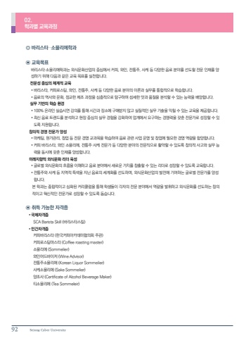 92 Sejong Cyber University02.%ud559%uacfc%ubcc4 %uad50%uc721%uacfc%uc815 %u25ce %ubc14%ub9ac%uc2a4%ud0c0 %u00b7%uc18c%ubbc8%ub9ac%uc5d0%ud559%uacfc %u2299 %uad50%uc721%ubaa9%ud45c %ubc14%ub9ac%uc2a4%ud0c0%u00b7%uc18c%ubbc8%ub9ac%uc5d0%ud559%uacfc%ub294 %uc678%uc2dd%ubb38%ud654%uc0b0%uc5c5%uc758 %uc911%uc2ec%uc5d0%uc11c %ucee4%ud53c, %uc640%uc778, %uc804%ud1b5%uc8fc, %uc0ac%ucf00 %ub4f1 %ub2e4%uc591%ud55c %uc74c%ub8cc %ubd84%uc57c%ub97c %uc120%ub3c4%ud560 %uc804%ubb38 %uc778%uc7ac%ub97c %uc591%uc131%ud558%uae30 %uc704%ud574 %ub2e4%uc74c%uacfc %uac19%uc740 %uad50%uc721 %ubaa9%ud45c%ub97c %uc2e4%ucc9c%ud569%ub2c8%ub2e4. %uc804%ubb38%uc131 %uc911%uc2ec%uc758 %uccb4%uacc4%uc801 %uad50%uc721 %u2022 %ubc14%ub9ac%uc2a4%ud0c0, %ucee4%ud53c%ub85c%uc2a4%ud305, %uc640%uc778, %uc804%ud1b5%uc8fc, %uc0ac%ucf00 %ub4f1 %ub2e4%uc591%ud55c %uc74c%ub8cc %ubd84%uc57c%uc758 %uc774%ub860%uacfc %uc2e4%ubb34%ub97c %ud1b5%ud569%uc801%uc73c%ub85c %ud559%uc2b5%ud569%ub2c8%ub2e4. %u2022 %uc74c%ub8cc%uc758 %uc5ed%uc0ac%uc640 %ubb38%ud654, %uc815%uad50%ud55c %uc81c%uc870 %uacfc%uc815%uc744 %uc2ec%uce35%uc801%uc73c%ub85c %ud0d0%uad6c%ud558%uba70 %uc12c%uc138%ud55c %ub9db%uacfc %ud488%uc9c8%uc744 %ubd84%uc11d%ud560 %uc218 %uc788%ub294 %ub2a5%ub825%uc744 %ubc30%uc591%ud569%ub2c8%ub2e4. %uc2e4%ubb34 %uae30%ubc18%uc758 %ud559%uc2b5 %ud658%uacbd %u2022 100% %uc628%ub77c%uc778 %uc2e4%uc2b5%uc2dc%uc5f0 %uac15%uc758%ub97c %ud1b5%ud574 %uc2dc%uac04%uacfc %uc7a5%uc18c%uc5d0 %uad6c%uc560%ubc1b%uc9c0 %uc54a%uace0 %uc2e4%uc9c8%uc801%uc778 %uc2e4%ubb34 %uae30%uc220%uc744 %uc775%ud790 %uc218 %uc788%ub294 %uad50%uc721%uc744 %uc81c%uacf5%ud569%ub2c8%ub2e4. %u2022 %ucd5c%uc2e0 %uc74c%ub8cc %ud2b8%ub80c%ub4dc%ub97c %ubd84%uc11d%ud558%uace0 %ud604%uc7a5 %uc911%uc2ec%uc758 %uc2e4%ubb34 %uacbd%ud5d8%uc744 %uac15%ud654%ud558%uc5ec %uc5c5%uacc4%uc5d0%uc11c %uc694%uad6c%ud558%ub294 %uacbd%uc7c1%ub825%uc744 %uac16%ucd98 %uc804%ubb38%uac00%ub85c %uc131%uc7a5%ud560 %uc218 %uc788%ub3c4%ub85d %uc9c0%uc6d0%ud569%ub2c8%ub2e4. %ucc3d%uc758%uc801 %uacbd%uc601 %uc804%ubb38%uac00 %uc591%uc131 %u2022 %ub9c8%ucf00%ud305, %uc6d0%uac00%uad00%ub9ac, %ucc3d%uc5c5 %ub4f1 %uc804%ubb38 %uacbd%uc601 %uad50%uacfc%ubaa9%uc744 %ud559%uc2b5%ud558%uc5ec %uc74c%ub8cc %uad00%ub828 %uc0ac%uc5c5 %uc6b4%uc601 %ubc0f %ucc3d%uc5c5%uc5d0 %ud544%uc694%ud55c %uacbd%uc601 %uc5ed%ub7c9%uc744 %ud568%uc591%ud569%ub2c8%ub2e4. %u2022 %ucee4%ud53c %ubc14%ub9ac%uc2a4%ud0c0, %uc640%uc778 %uc18c%ubbc8%ub9ac%uc5d0, %uc804%ud1b5%uc8fc%u00b7%uc0ac%ucf00 %uc804%ubb38%uac00 %ub4f1 %ub2e4%uc591%ud55c %ubd84%uc57c%uc758 %uc804%ubb38%uc9c1%uc73c%ub85c %ud65c%uc57d%ud560 %uc218 %uc788%ub3c4%ub85d %ucc3d%uc758%uc801 %uc0ac%uace0%uc640 %uc2e4%ubb34 %ub2a5%ub825%uc744 %ub3d9%uc2dc%uc5d0 %uac16%ucd98 %uc778%uc7ac%ub97c %uc591%uc131%ud569%ub2c8%ub2e4. %ubbf8%ub798%uc9c0%ud5a5%uc801 %uc678%uc2dd%ubb38%ud654 %ub9ac%ub354 %uc721%uc131 %u2022 %uae00%ub85c%ubc8c %uc678%uc2dd%ubb38%ud654%uc758 %ud750%ub984%uc744 %uc774%ud574%ud558%uace0 %uc74c%ub8cc %ubd84%uc57c%uc5d0%uc11c %uc0c8%ub85c%uc6b4 %uac00%uce58%ub97c %ucc3d%ucd9c%ud560 %uc218 %uc788%ub294 %ub9ac%ub354%ub85c %uc131%uc7a5%ud560 %uc218 %uc788%ub3c4%ub85d %uad50%uc721%ud569%ub2c8%ub2e4. %u2022 %uc804%ud1b5%uc8fc%uc640 %uc0ac%ucf00 %ub4f1 %uc9c0%uc5ed%uc801 %ud2b9%uc0c9%uc744 %uc9c0%ub2cc %uc74c%ub8cc%uc758 %uc138%uacc4%ud654%ub97c %uc120%ub3c4%ud558%uba70, %uc678%uc2dd%ubb38%ud654%uc0b0%uc5c5%uc758 %ubc1c%uc804%uc5d0 %uae30%uc5ec%ud558%ub294 %uae00%ub85c%ubc8c %uc804%ubb38%uac00%ub97c %uc591%uc131%ud569%ub2c8%ub2e4. %ubcf8 %ud559%uacfc%ub294 %uc885%ud569%uc801%uc774%uace0 %uc2ec%ud654%ub41c %ucee4%ub9ac%ud058%ub7fc%uc744 %ud1b5%ud574 %ud559%uc0dd%ub4e4%uc774 %uac01%uc790%uc758 %uc804%ubb38 %ubd84%uc57c%uc5d0%uc11c %uc5ed%ub7c9%uc744 %ubc1c%ud718%ud558%uace0 %uc678%uc2dd%ubb38%ud654%ub97c %uc120%ub3c4%ud558%ub294 %ucc3d%uc758%uc801%uc774%uace0 %ud601%uc2e0%uc801%uc778 %uc804%ubb38%uac00%ub85c %uc131%uc7a5%ud560 %uc218 %uc788%ub3c4%ub85d %ub3d5%uc2b5%ub2c8%ub2e4. %u2299 %ucde8%ub4dd %uac00%ub2a5%ud55c %uc790%uaca9%uc99d %u2022 %uad6d%uc81c%uc790%uaca9%uc99d SCA Barista Skill (%ubc14%ub9ac%uc2a4%ud0c0%uc2a4%ud0ac) %u2022 %ubbfc%uac04%uc790%uaca9%uc99d %ucee4%ud53c%ubc14%ub9ac%uc2a4%ud0c0 (%ud55c%uad6d%ucee4%ud53c%uc544%uce74%ub370%ubbf8%ud611%uc758%ud68c %uc8fc%uad00) %ucee4%ud53c%ub85c%uc2a4%ud305%ub9c8%uc2a4%ud130 (Coffee roasting master) %uc18c%ubbc8%ub9ac%uc5d0 (Sommelier) %uc640%uc778%uc5b4%ub4dc%ubc14%uc774%uc800 (Wine Advisor) %uc804%ud1b5%uc8fc%uc18c%ubbc8%ub9ac%uc5d0 (Korean Liquor Sommelier) %uc0ac%ucf00%uc18c%ubbc8%ub9ac%uc5d0 (Sake Sommelier) %uc591%uc870%uc0ac (Certificate of Alcohol Beverage Maker) %ud2f0%uc18c%ubbc8%ub9ac%uc5d0 (Tea Sommeleir)